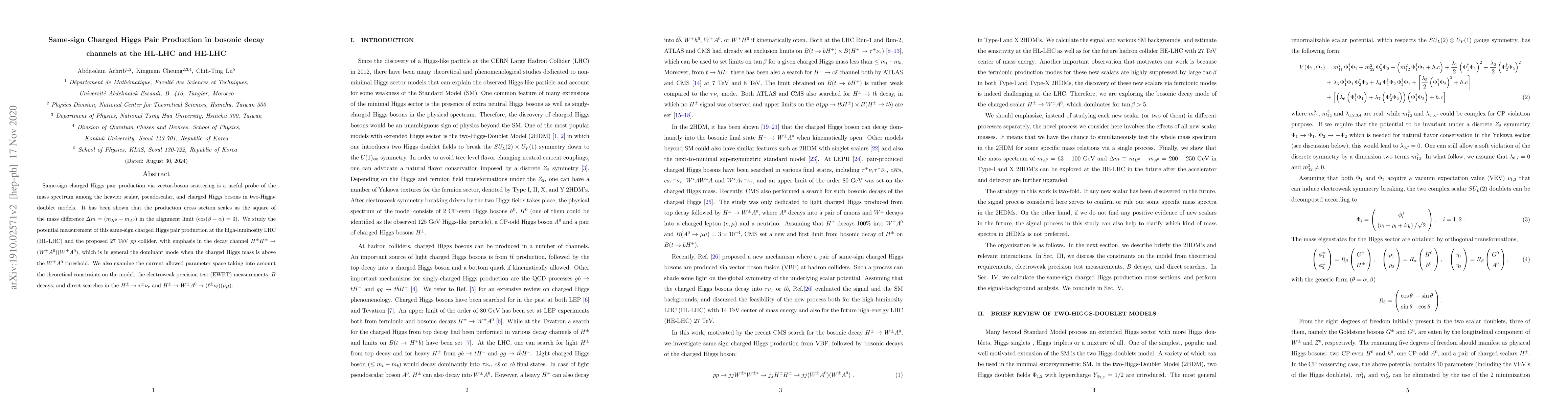 This paper investigates the potential for detecting same-sign charged Higgs pair production via vector-boson scattering at the HL-LHC and HE-LHC, focusing on the bosonic decay channel $H^\pm H^\pm \to (W^\pm A^0 ) (W^\pm A^0)$. It examines the production cross section's dependence on the mass difference between scalar and pseudoscalar Higgs bosons and considers theoretical constraints and current parameter space.