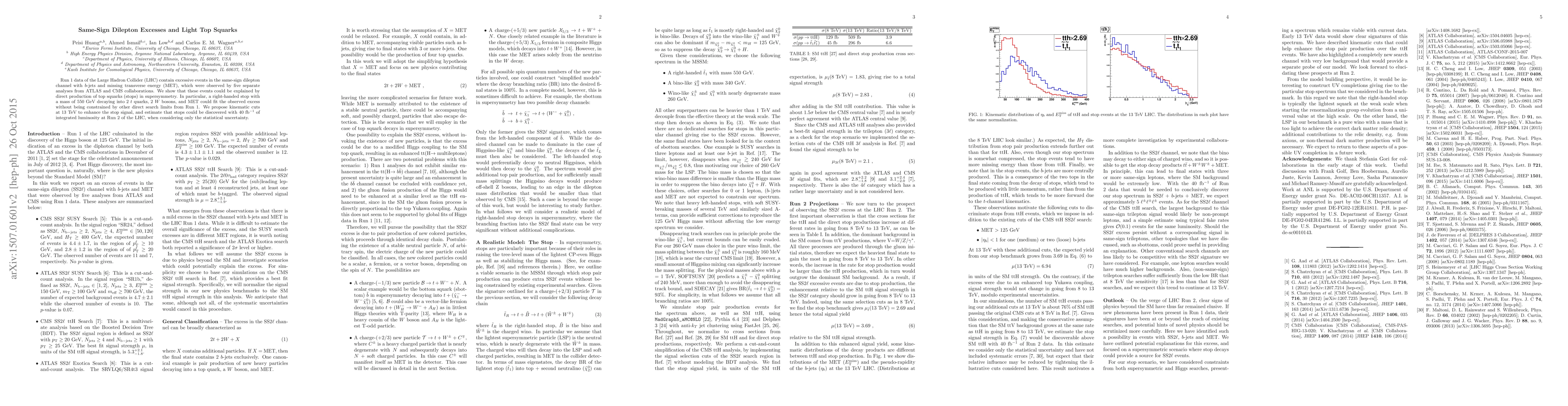 This paper investigates same-sign dilepton excesses in LHC Run 1 data, suggesting they may arise from the direct production of light top squarks (stops) in supersymmetry. It proposes kinematic cuts to enhance the stop signal and estimates that stops could be discovered with 40 inverse fb of integrated luminosity in LHC Run 2.
