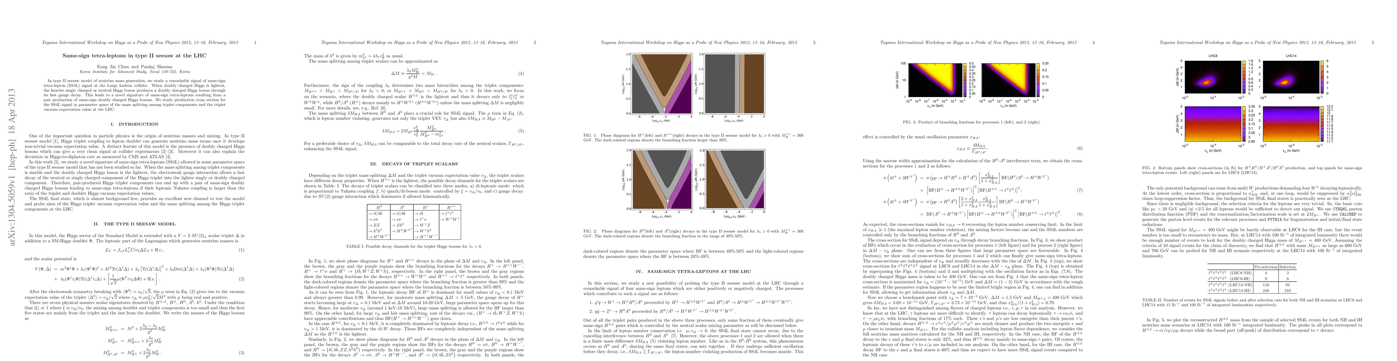 This research explores a unique same-sign tetra-lepton (SS4L) signal in the type II seesaw model at the LHC. It demonstrates that when the doubly charged Higgs is lightest, it can be produced via the fast gauge decay of heavier singly or neutral Higgs bosons, resulting in a distinctive SS4L signature from doubly charged Higgs pair production. The study analyzes the production cross section for this SS4L signal in the context of mass splitting among triplet components and triplet vacuum expectation value at the LHC.