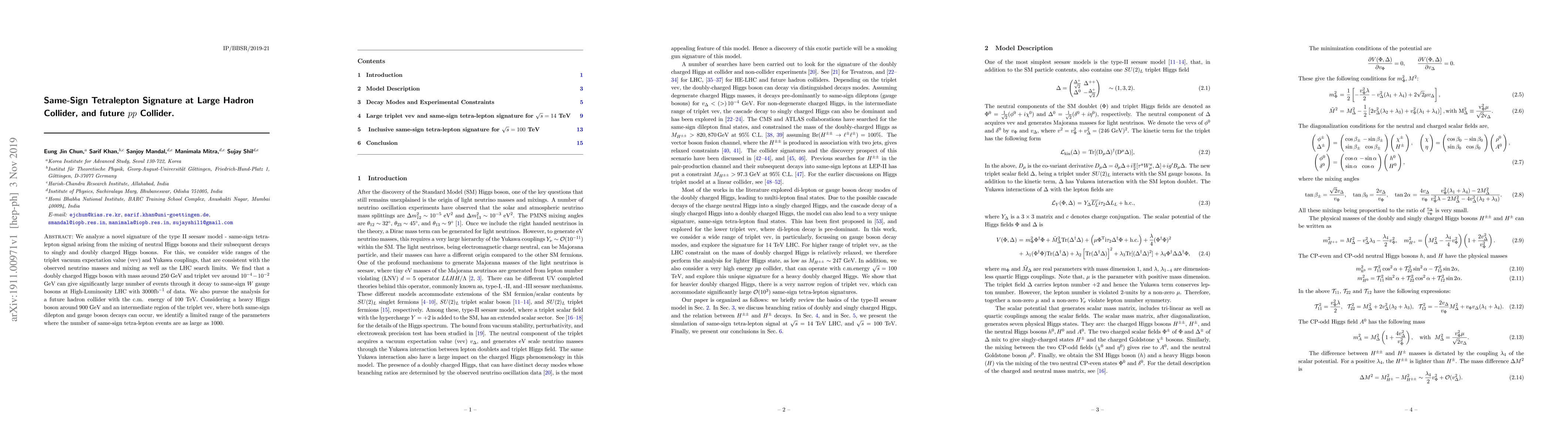 This paper investigates a same-sign tetralepton signature in the type II seesaw model, focusing on neutral Higgs boson mixing and decays to charged Higgs bosons. It finds significant event potential for a doubly charged Higgs around 250 GeV at the High-Luminosity LHC, and identifies a parameter range for a future 100 TeV collider yielding up to 1000 same-sign tetralepton events.