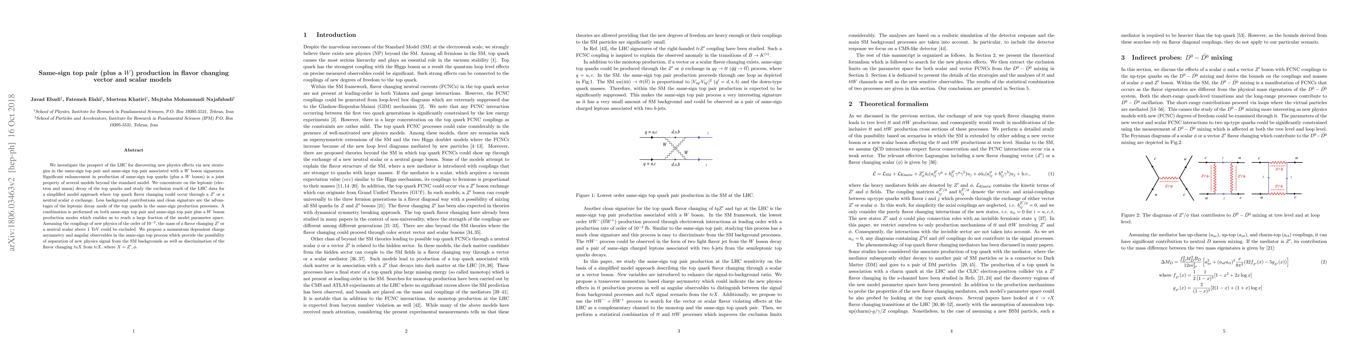 This paper explores the LHC's potential to detect new physics via same-sign top pair and top pair plus $W$ boson signatures, focusing on leptonic decay modes for cleaner signals. It proposes new strategies to exclude flavor changing $Z'$ or scalar $\phi$ models with masses above 1 TeV, using momentum-dependent charge asymmetry and angular observables.