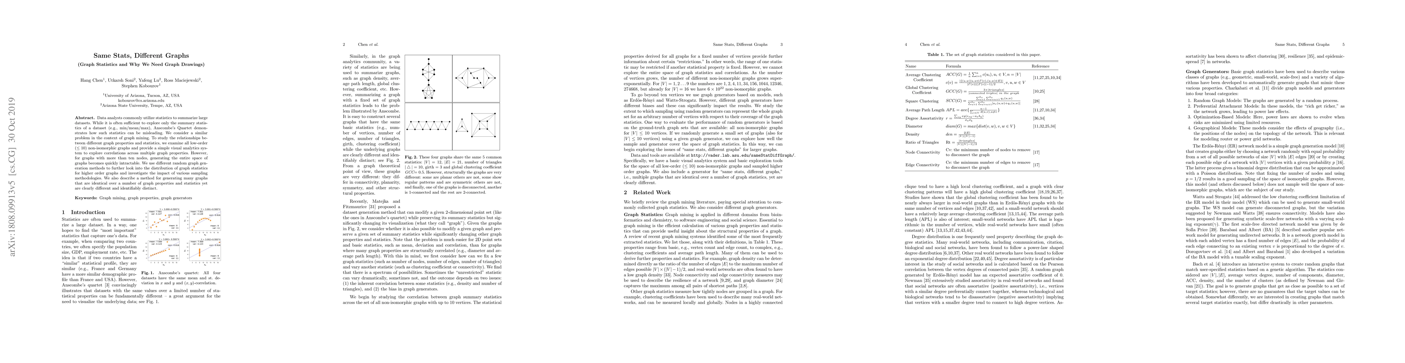 Data analysts commonly utilize statistics to summarize large datasets. While it is often sufficient to explore only the summary statistics of a dataset (e.g., min/mean/max), Anscombe's Quartet demonstrates how such statistics can be misleading. Graph mining has a similar problem in that graph statistics (e.g., density, connectivity, clustering coefficient) may not capture all of the critical properties of a given graph. To study the relationships between different graph properties and statistics, we examine all low-order (<= 10) non-isomorphic graphs and provide a simple visual analytics system to explore correlations across multiple graph properties. However, for graphs with more than ten nodes, generating the entire space of graphs becomes quickly intractable. We use different random graph generation methods to further look into the distribution of graph statistics for higher order graphs and investigate the impact of various sampling methodologies. We also describe a method for generating many graphs that are identical over a number of graph properties and statistics yet are clearly different and identifiably distinct.