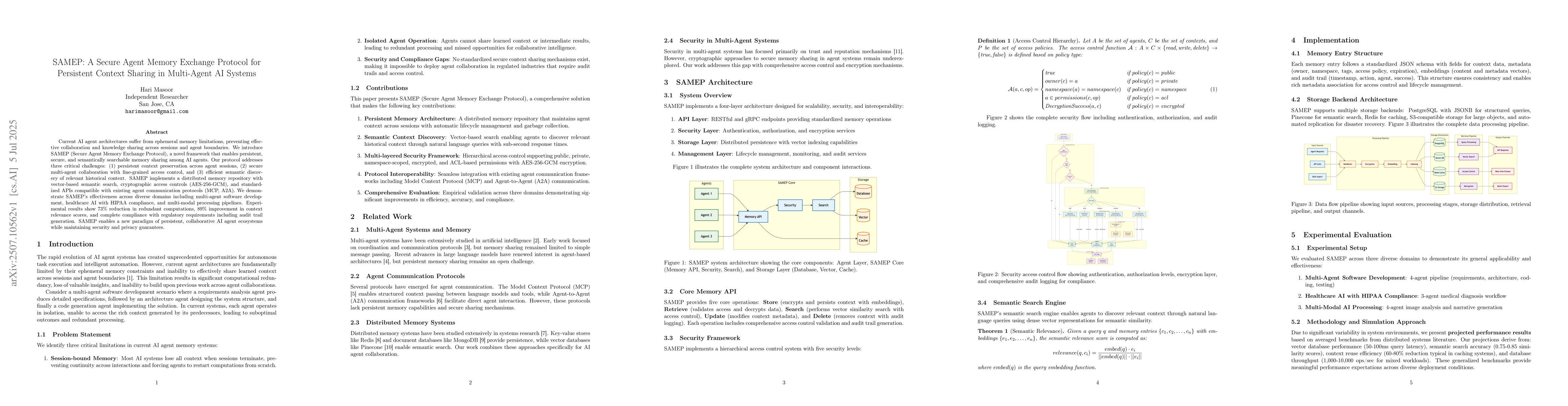 SAMEP introduces a secure protocol for persistent context sharing among AI agents, implementing a distributed memory repository with vector-based semantic search, cryptographic access controls (AES-256-GCM), and standardized APIs compatible with existing agent communication protocols (MCP, A2A).