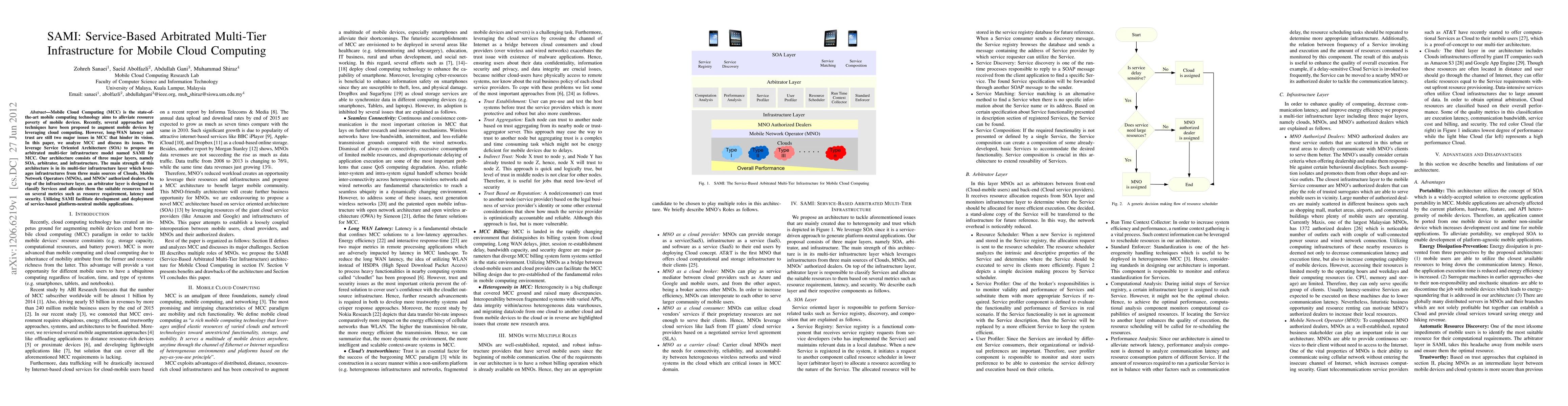 This paper proposes SAMI, a Service-Based Arbitrated Multi-Tier Infrastructure for Mobile Cloud Computing, addressing long-WAN latency and trust issues. It leverages a Service Oriented Architecture with three layers: SOA, arbitrator, and infrastructure, utilizing resources from clouds, mobile network operators, and authorized dealers to optimize resource allocation.