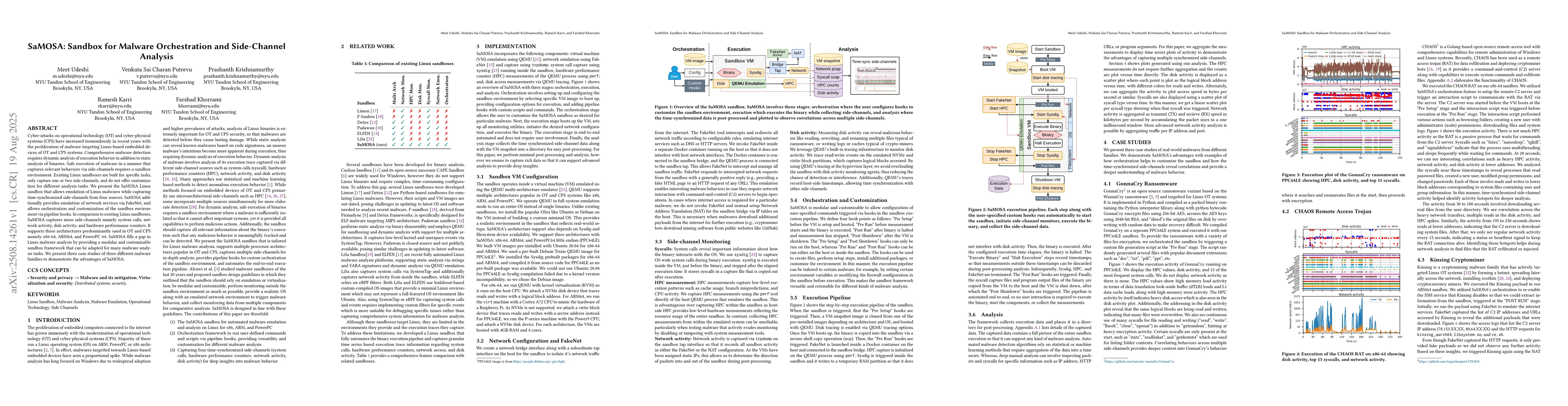 SaMOSA is a Linux sandbox framework designed for comprehensive malware analysis on Linux systems, supporting full-system emulation across multiple architectures (x86-64, ARM64, PPC64LE) and capturing time-synchronized execution data across four key side-channels (system calls, hardware performance counters, disk activity, and network traffic).