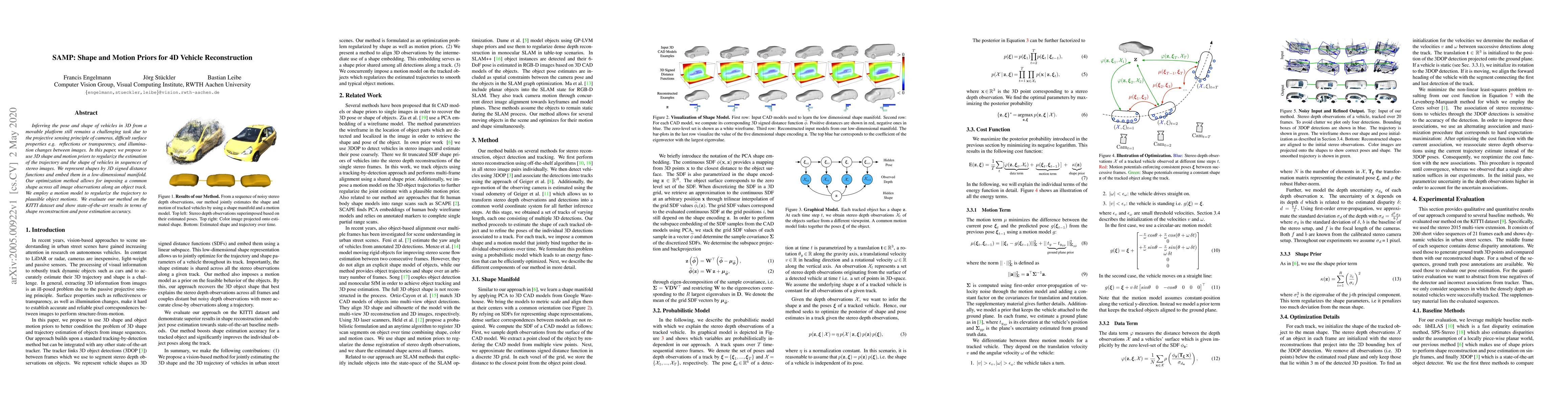 This paper introduces SAMP, a method that uses shape and motion priors to improve 3D vehicle reconstruction from stereo images, achieving more accurate shape and pose estimates. It models vehicle shapes with 3D signed distance functions and employs motion constraints, demonstrating state-of-the-art results on the KITTI dataset.