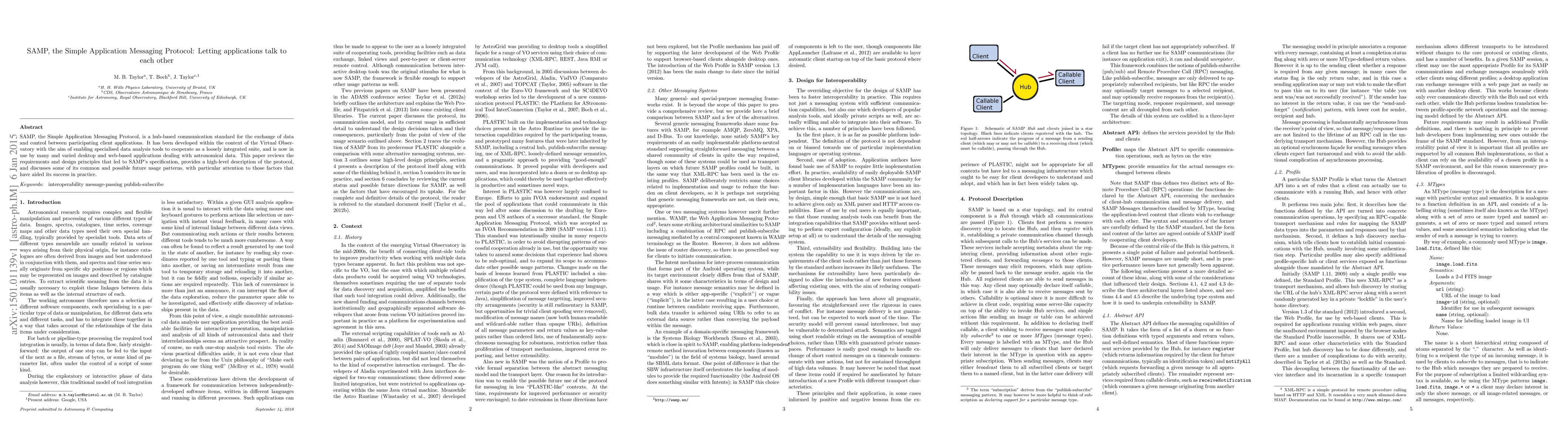 SAMP, the Simple Application Messaging Protocol, is a hub-based communication standard for the exchange of data and control between participating client applications. It has been developed within the context of the Virtual Observatory with the aim of enabling specialised data analysis tools to cooperate as a loosely integrated suite, and is now in use by many and varied desktop and web-based applications dealing with astronomical data. This paper reviews the requirements and design principles that led to SAMP's specification, provides a high-level description of the protocol, and discusses some of its common and possible future usage patterns, with particular attention to those factors that have aided its success in practice.