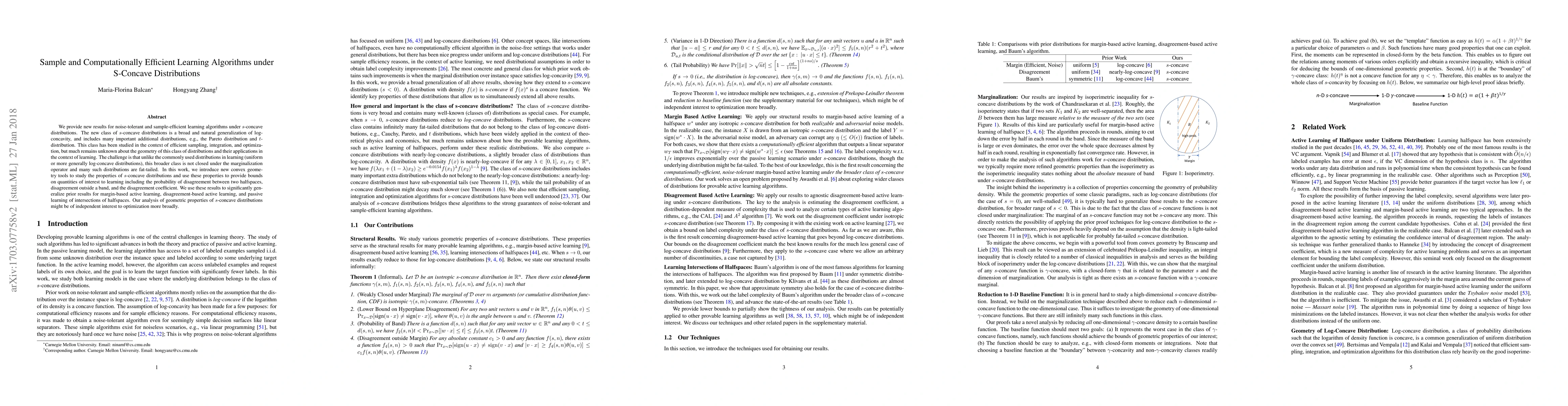 This paper introduces novel learning algorithms under $s$-concave distributions, a broad generalization of log-concavity that includes distributions like Pareto and $t$-distributions. It leverages new convex geometry tools to study these distributions' properties and provides bounds on learning-related quantities, significantly advancing margin-based, disagreement-based active learning, and passive learning of halfspace intersections.