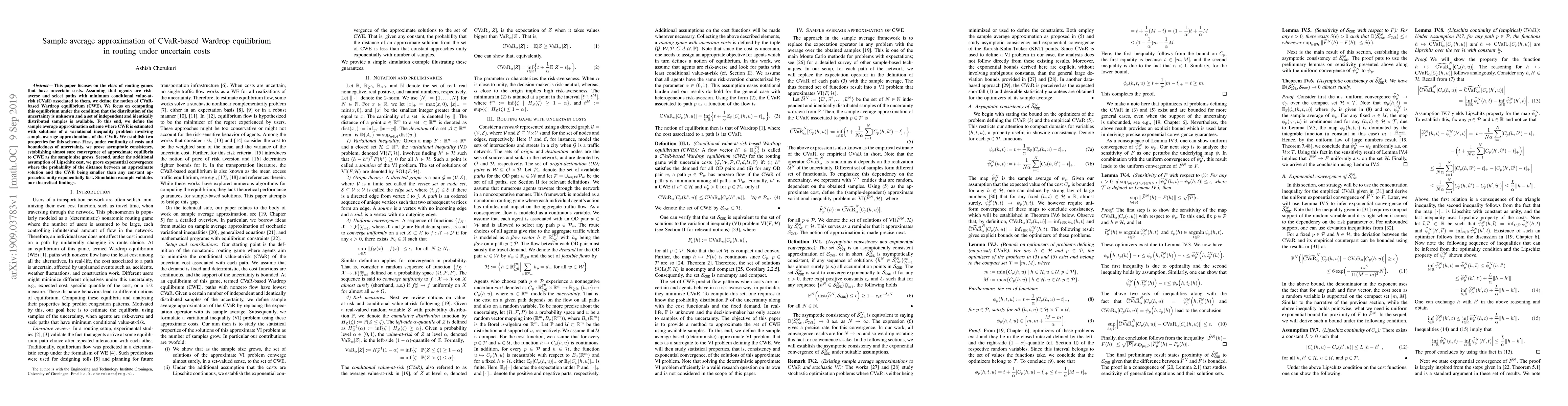 This paper introduces the concept of CVaR-based Wardrop equilibrium in routing games with uncertain costs, proposing a sample average approximation method to compute this equilibrium when the uncertainty distribution is unknown. It proves asymptotic consistency and exponential convergence under certain conditions, validated by simulation examples.