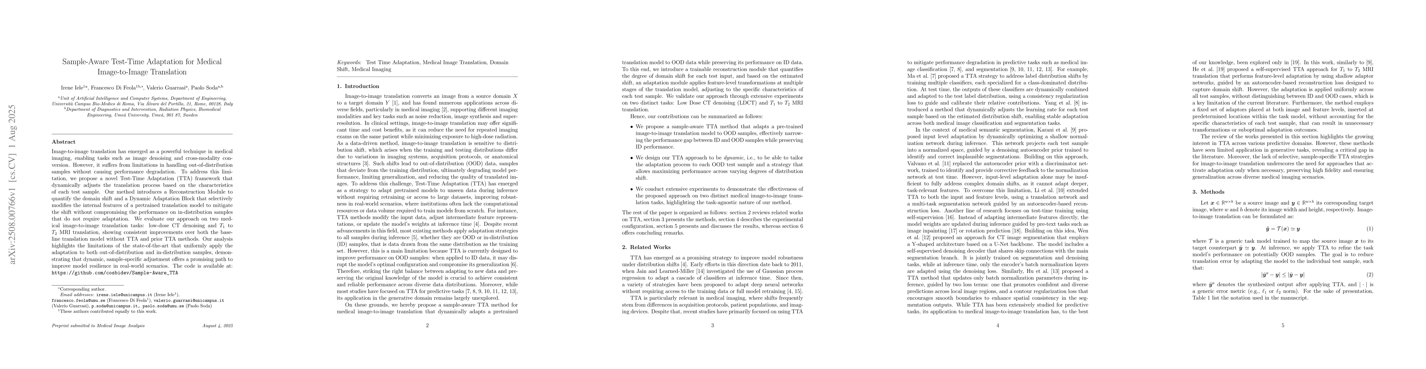 Image-to-image translation has emerged as a powerful technique in medical imaging, enabling tasks such as image denoising and cross-modality conversion. However, it suffers from limitations in handling out-of-distribution samples without causing performance degradation. To address this limitation, we propose a novel Test-Time Adaptation (TTA) framework that dynamically adjusts the translation process based on the characteristics of each test sample. Our method introduces a Reconstruction Module to quantify the domain shift and a Dynamic Adaptation Block that selectively modifies the internal features of a pretrained translation model to mitigate the shift without compromising the performance on in-distribution samples that do not require adaptation. We evaluate our approach on two medical image-to-image translation tasks: low-dose CT denoising and T1 to T2 MRI translation, showing consistent improvements over both the baseline translation model without TTA and prior TTA methods. Our analysis highlights the limitations of the state-of-the-art that uniformly apply the adaptation to both out-of-distribution and in-distribution samples, demonstrating that dynamic, sample-specific adjustment offers a promising path to improve model resilience in real-world scenarios. The code is available at: https://github.com/cosbidev/Sample-Aware_TTA.