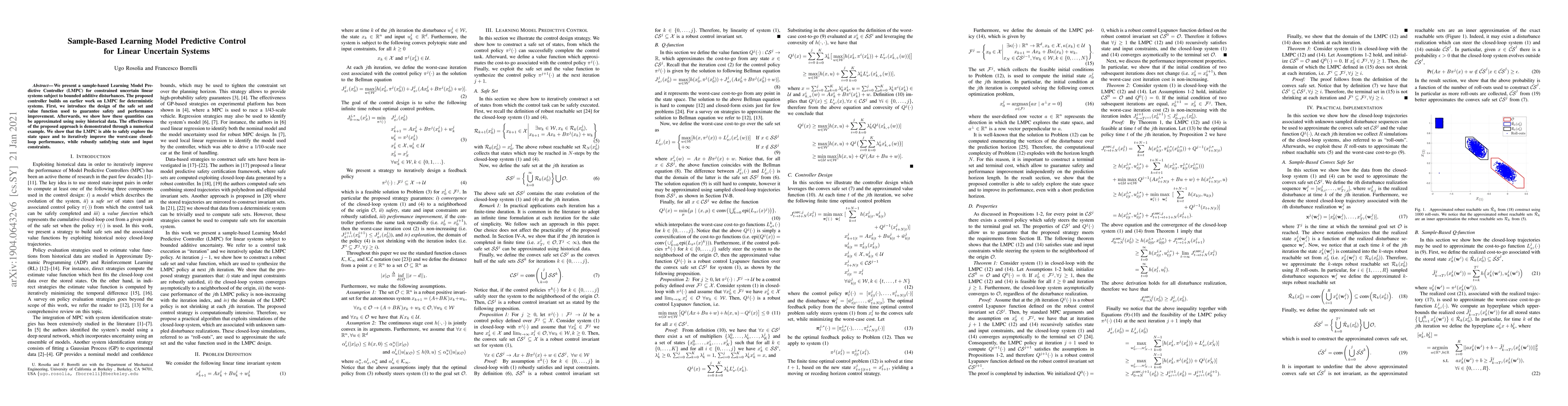 This paper proposes a sample-based Learning Model Predictive Controller (LMPC) for uncertain linear systems with disturbances, utilizing historical data to approximate safe sets and value functions for safety and performance. The effectiveness is demonstrated through a numerical example showing safe state space exploration and iterative performance improvement while satisfying constraints.