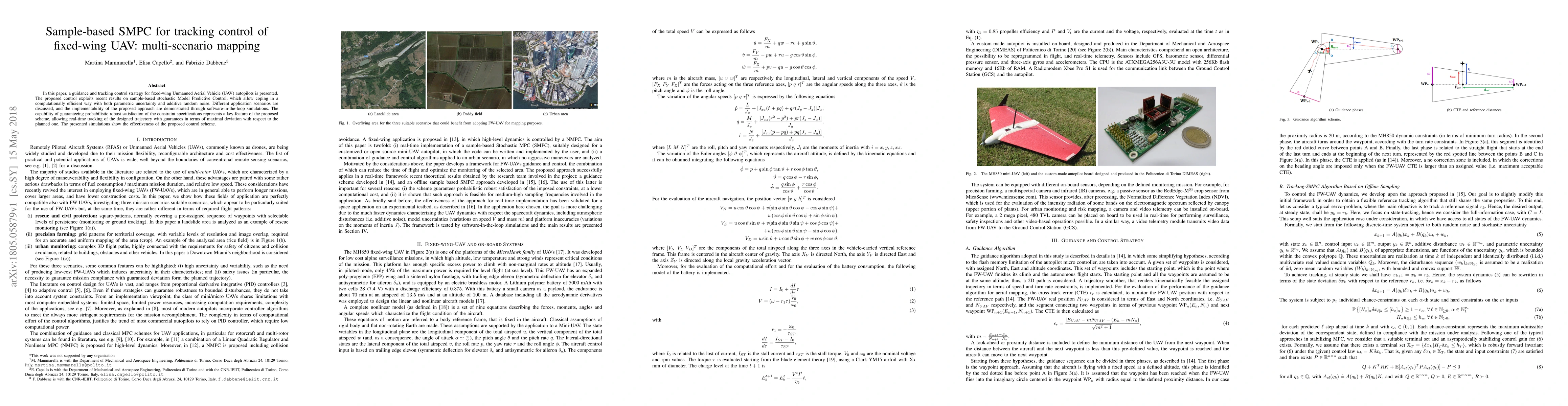 This paper proposes a sample-based stochastic Model Predictive Control strategy for fixed-wing UAV tracking control, effectively managing parametric uncertainty and noise. The approach guarantees probabilistic robust satisfaction of constraints, demonstrated through software-in-the-loop simulations across various scenarios.