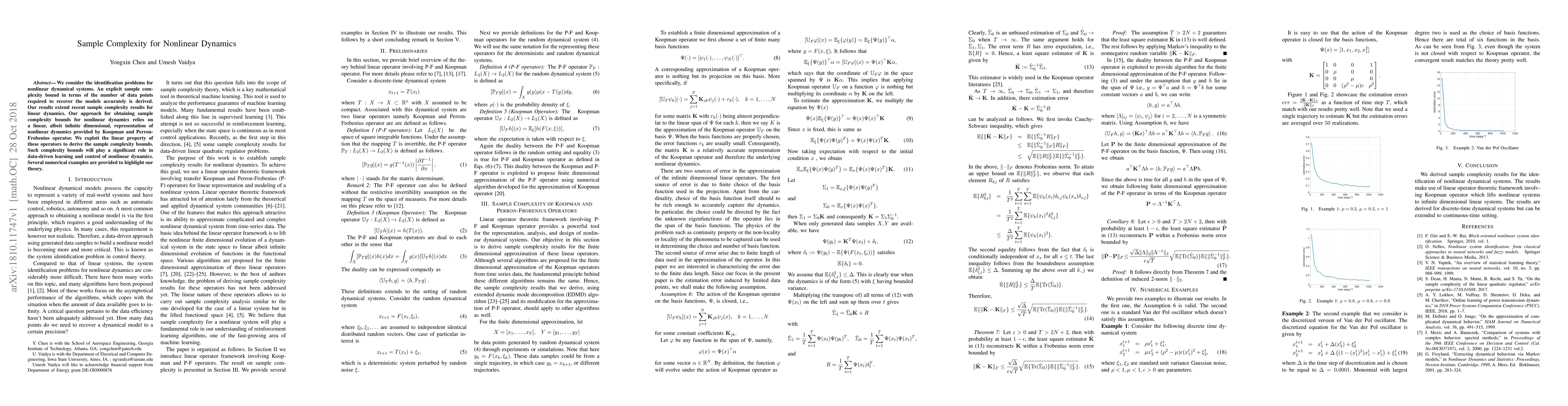 We consider the identification problems for nonlinear dynamical systems. An explicit sample complexity bound in terms of the number of data points required to recover the models accurately is derived. Our results extend recent sample complexity results for linear dynamics. Our approach for obtaining sample complexity bounds for nonlinear dynamics relies on a linear, albeit infinite dimensional, representation of nonlinear dynamics provided by Koopman and Perron-Frobenius operator. We exploit the linear property of these operators to derive the sample complexity bounds. Such complexity bounds will play a significant role in data-driven learning and control of nonlinear dynamics. Several numerical examples are provided to highlight our theory.