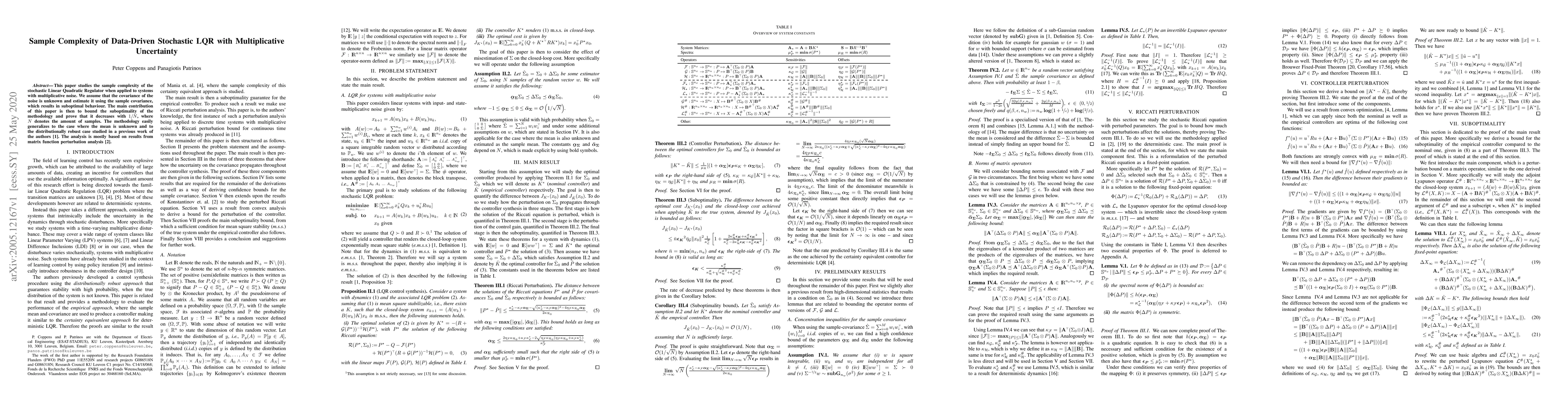 This paper investigates the sample complexity of data-driven stochastic Linear Quadratic Regulators (LQR) under multiplicative uncertainty. It bounds the suboptimality of sample covariance-based noise covariance estimation, proving that it decreases with 1/N, where N is the sample size.