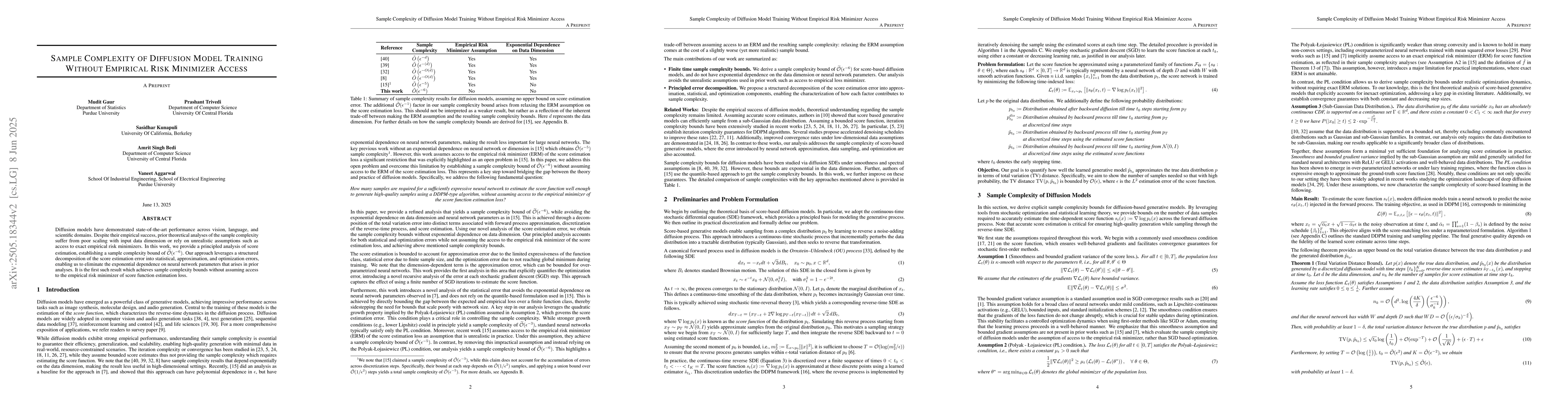 The research analyzes the sample complexity of diffusion model training without access to empirical risk minimizers, decomposing score estimation error into statistical, approximation, and optimization errors.