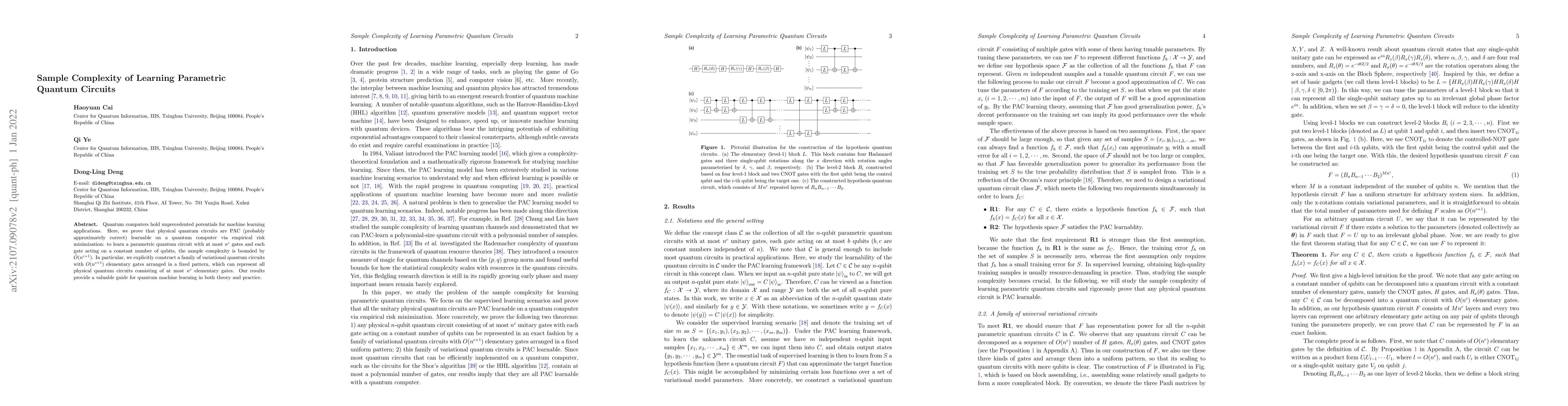This paper demonstrates that parametric quantum circuits can be learned on a quantum computer via empirical risk minimization with a sample complexity of $\tilde{O}(n^{c+1})$, where $n^c$ represents the number of gates in the circuit. The authors construct a family of variational quantum circuits to represent all physical quantum circuits, offering practical insights for quantum machine learning.