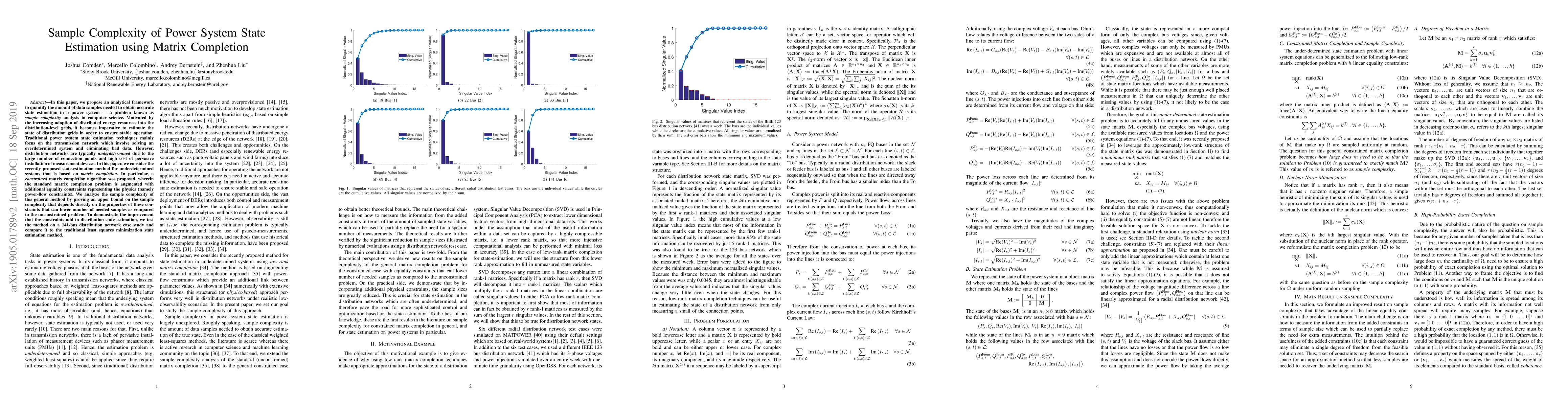 This paper proposes an analytical framework to determine the data sample complexity for accurate power system state estimation using matrix completion, focusing on distribution grids. It introduces a constrained matrix completion method with power-flow constraints to reduce the number of required samples compared to traditional methods, validated through a 141-bus distribution network case study.
