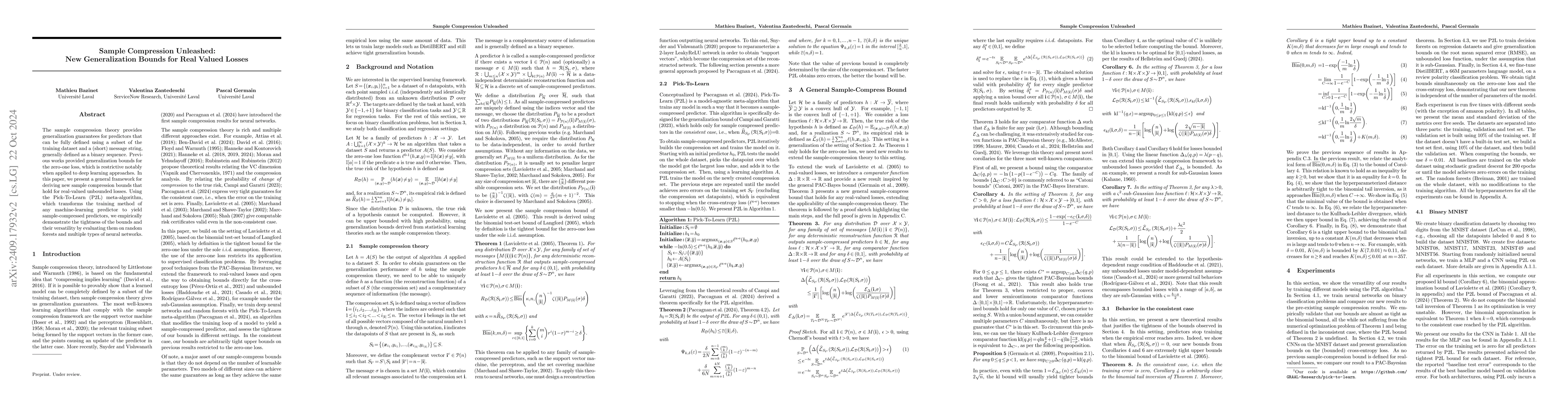 This paper introduces a new framework for deriving generalization bounds based on sample compression theory applicable to real-valued losses, extending beyond the restrictive zero-one loss. It evaluates the effectiveness of these bounds across various models like neural networks and decision forests, demonstrating their tightness and versatility through experiments with the Pick-To-Learn meta-algorithm.