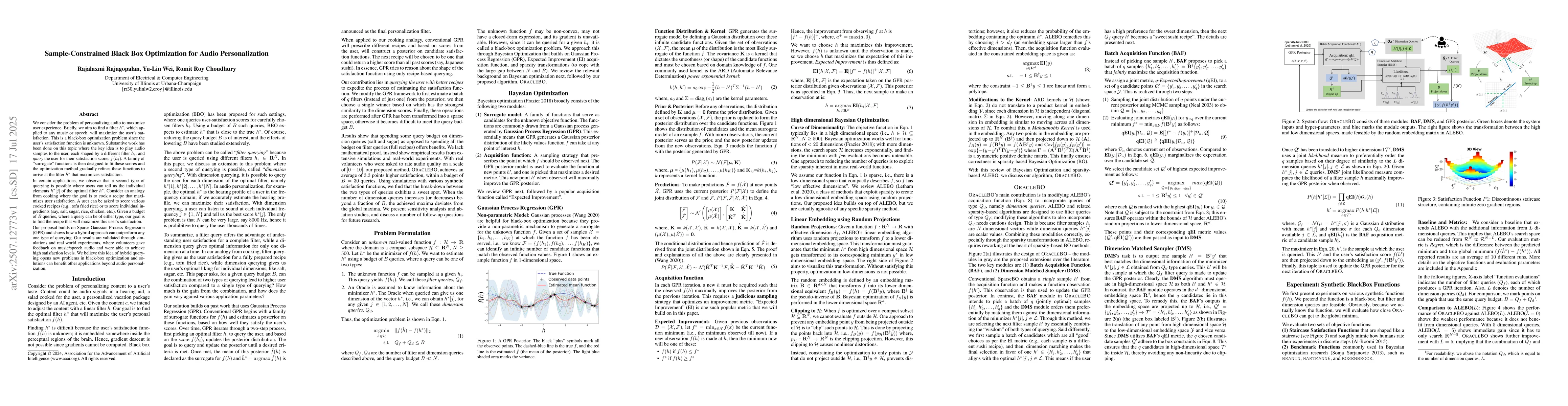 We consider the problem of personalizing audio to maximize user experience. Briefly, we aim to find a filter $h^*$, which applied to any music or speech, will maximize the user's satisfaction. This is a black-box optimization problem since the user's satisfaction function is unknown. Substantive work has been done on this topic where the key idea is to play audio samples to the user, each shaped by a different filter $h_i$, and query the user for their satisfaction scores $f(h_i)$. A family of ``surrogate" functions is then designed to fit these scores and the optimization method gradually refines these functions to arrive at the filter $\hat{h}^*$ that maximizes satisfaction. In certain applications, we observe that a second type of querying is possible where users can tell us the individual elements $h^*[j]$ of the optimal filter $h^*$. Consider an analogy from cooking where the goal is to cook a recipe that maximizes user satisfaction. A user can be asked to score various cooked recipes (e.g., tofu fried rice) or to score individual ingredients (say, salt, sugar, rice, chicken, etc.). Given a budget of $B$ queries, where a query can be of either type, our goal is to find the recipe that will maximize this user's satisfaction. Our proposal builds on Sparse Gaussian Process Regression (GPR) and shows how a hybrid approach can outperform any one type of querying. Our results are validated through simulations and real world experiments, where volunteers gave feedback on music/speech audio and were able to achieve high satisfaction levels. We believe this idea of hybrid querying opens new problems in black-box optimization and solutions can benefit other applications beyond audio personalization.