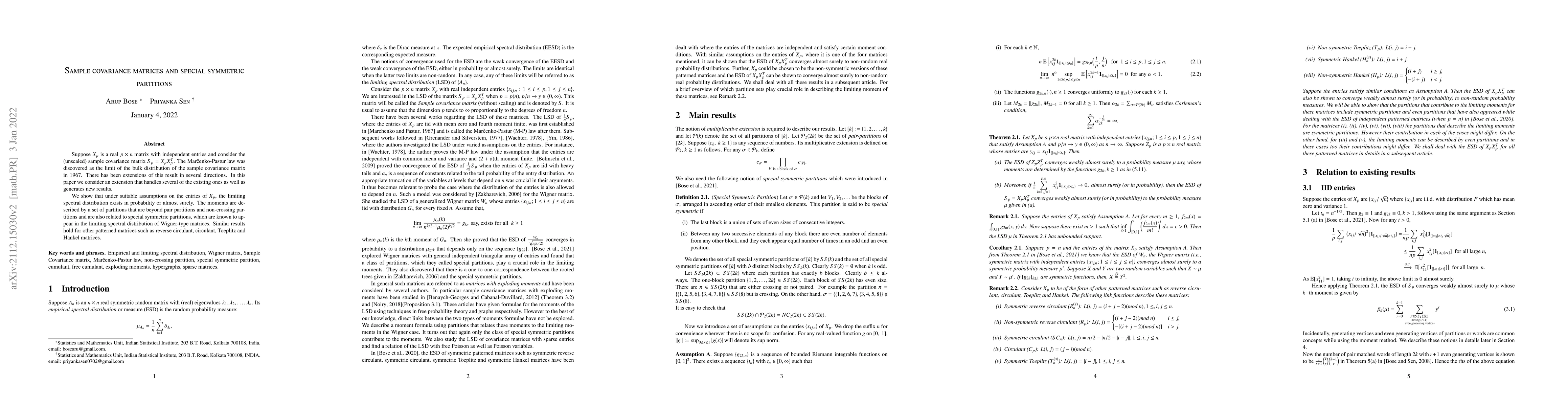 Suppose $X_p$ is a real $p \times n$ matrix with independent entries and consider the (unscaled) sample covariance matrix $S_p=X_pX_p^T$. The Marchenko-Pastur law was discovered as the limit of the bulk distribution of the sample covariance matrix in 1967. There have been extensions of this result in several directions. In this paper, we consider an extension that handles several of the existing ones as well as generates new results. We show that under suitable assumptions on the entries of $X_p$, the limiting spectral distribution exists in probability or almost surely. The moments are described by a set of partitions that are beyond pair partitions and non-crossing partitions and are also related to special symmetric partitions, which are known to appear in the limiting spectral distribution of Wigner-type matrices. Similar results hold for other patterned matrices such as reverse circulant, circulant, Toeplitz, and Hankel matrices.
