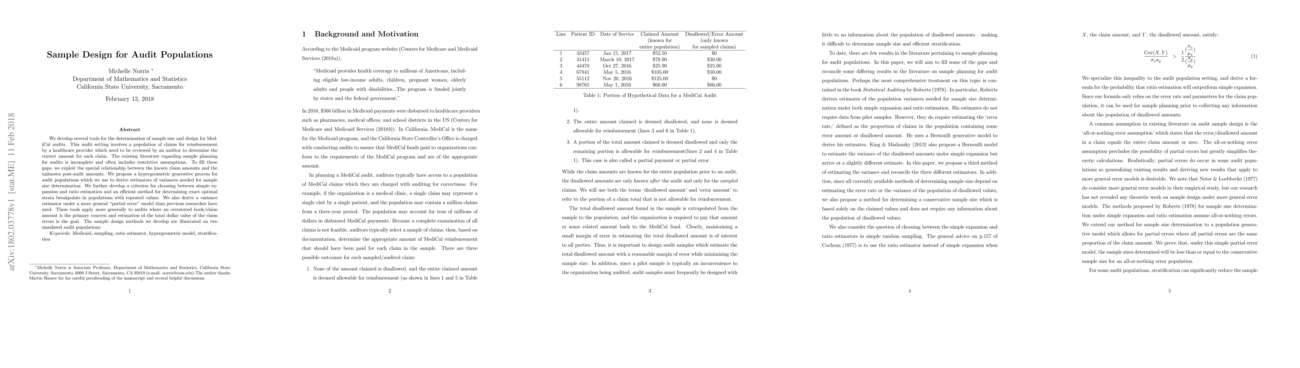 We develop several tools for the determination of sample size and design for MediCal audits. This audit setting involves a population of claims for reimbursement by a healthcare provider which need to be reviewed by an auditor to determine the correct amount for each claim. The existing literature regarding sample planning for audits is incomplete and often includes restrictive assumptions. To fill these gaps, we exploit the special relationship between the known claim amounts and the unknown post-audit amounts. We propose a hypergeometric generative process for audit populations which we use to derive estimators of variances needed for sample size determination. We further develop a criterion for choosing between simple expansion and ratio estimation and an efficient method for determining exact optimal strata breakpoints in populations with repeated values. We also derive a variance estimator under a more general "partial error" model than previous researchers have used. These tools apply more generally to audits where an overstated book/claim amount is the primary concern and estimation of the total dollar value of the claim errors is the goal. The sample design methods we develop are illustrated on two simulated audit populations.