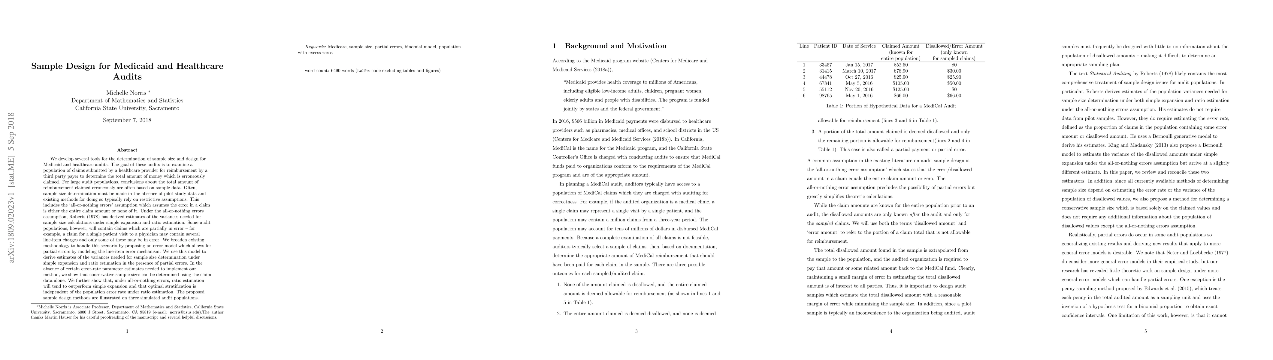 We develop several tools for the determination of sample size and design for Medicaid and healthcare audits. The goal of these audits is to examine a population of claims submitted by a healthcare provider for reimbursement by a third party payer to determine the total amount of money which is erroneously claimed. For large audit populations, conclusions about the total amount of reimbursement claimed erroneously are often based on sample data. Often, sample size determination must be made in the absence of pilot study data and existing methods for doing so typically rely on restrictive assumptions. This includes the `all-or-nothing errors' assumption which assumes the error in a claim is either the entire claim amount or none of it. Under the all-or-nothing errors assumption, Roberts (1978) has derived estimates of the variances needed for sample size calculations under simple expansion and ratio estimation. Some audit populations, however, will contain claims which are partially in error. We broaden existing methodology to handle this scenario by proposing an error model which allows for partial errors by modeling the line-item error mechanism. We use this model to derive estimates of the variances needed for sample size determination under simple expansion and ratio estimation in the presence of partial errors. In the absence of certain error-rate parameter estimates needed to implement our method, we show that conservative sample sizes can be determined using the claim data alone. We further show that, under all-or-nothing errors, ratio estimation will tend to outperform simple expansion and that optimal stratification is independent of the population error rate under ratio estimation. The proposed sample design methods are illustrated on three simulated audit populations.