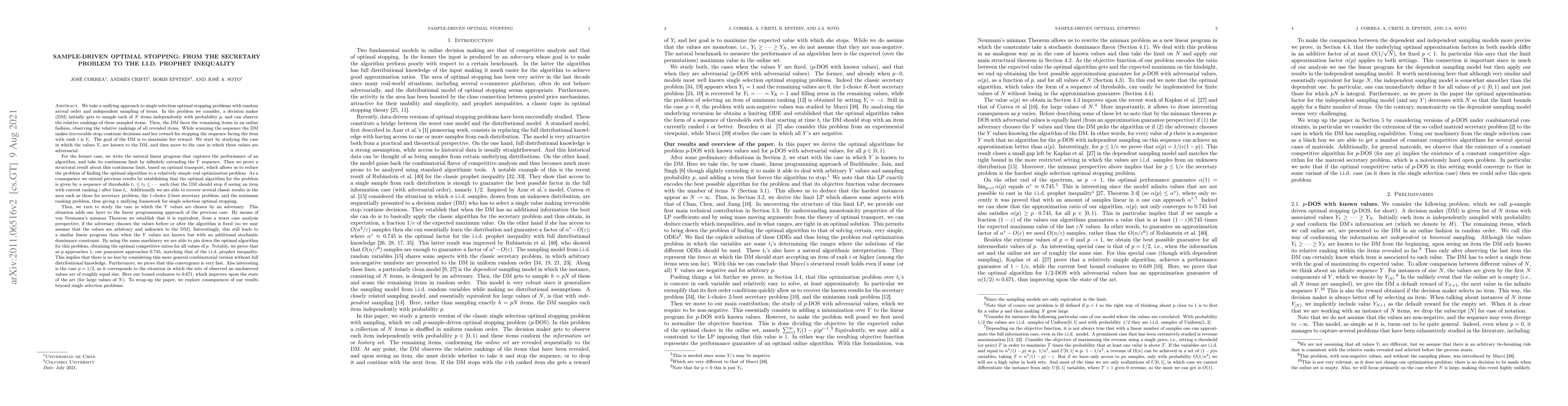 We take a unifying approach to single selection optimal stopping problems with random arrival order and independent sampling of items. In the problem we consider, a decision maker (DM) initially gets to sample each of $N$ items independently with probability $p$, and can observe the relative rankings of these sampled items. Then, the DM faces the remaining items in an online fashion, observing the relative rankings of all revealed items. While scanning the sequence the DM makes irrevocable stop/continue decisions and her reward for stopping the sequence facing the item with rank $i$ is $Y_i$. The goal of the DM is to maximize her reward. We start by studying the case in which the values $Y_i$ are known to the DM, and then move to the case in which these values are adversarial. For the former case, we write the natural linear program that captures the performance of an algorithm, and take its continuous limit. We prove a structural result about this continuous limit, which allows us to reduce the problem to a relatively simple real optimization problem. We establish that the optimal algorithm is given by a sequence of thresholds $t_1\le t_2\le\cdots$ such that the DM should stop if seeing an item with current ranking $i$ after time $t_i$. Additionally we are able to recover several classic results in the area such as those for secretary problem and the minimum ranking problem. For the adversarial case, we obtain a similar linear program with an additional stochastic dominance constraint. Using the same machinery we are able to pin down the optimal competitive ratios for all values of $p$. Notably, we prove that as $p$ approaches 1, our guarantee converges linearly to 0.745, matching that of the i.i.d.~prophet inequality. Also interesting is the case $p=1/2$, where our bound evaluates to $0.671$, which improves upon the state of the art.