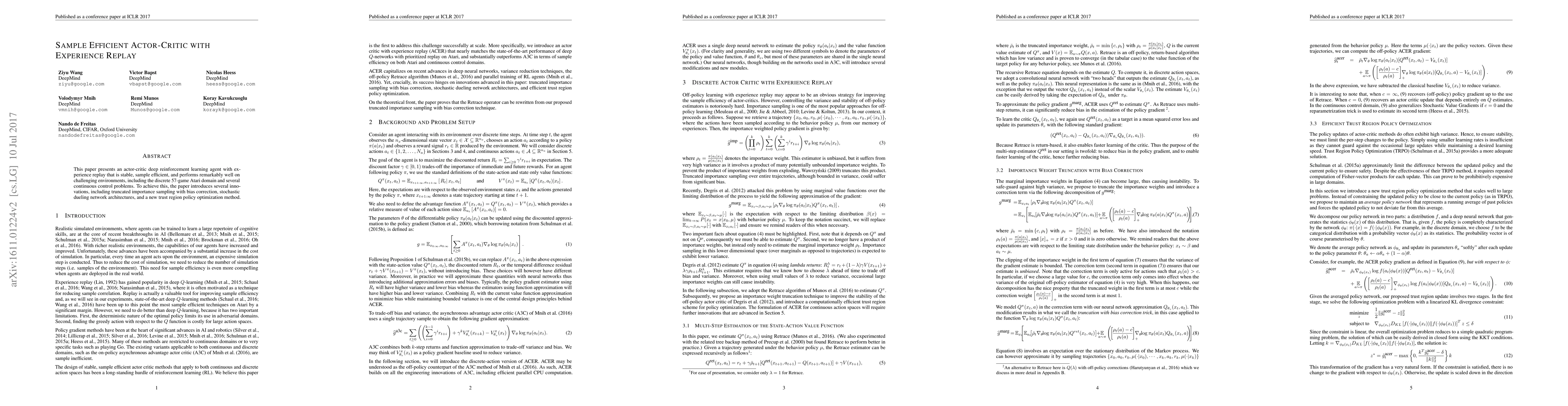 This paper presents an actor-critic deep reinforcement learning agent with experience replay that is stable, sample efficient, and performs remarkably well on challenging environments, including the discrete 57-game Atari domain and several continuous control problems. To achieve this, the paper introduces several innovations, including truncated importance sampling with bias correction, stochastic dueling network architectures, and a new trust region policy optimization method.