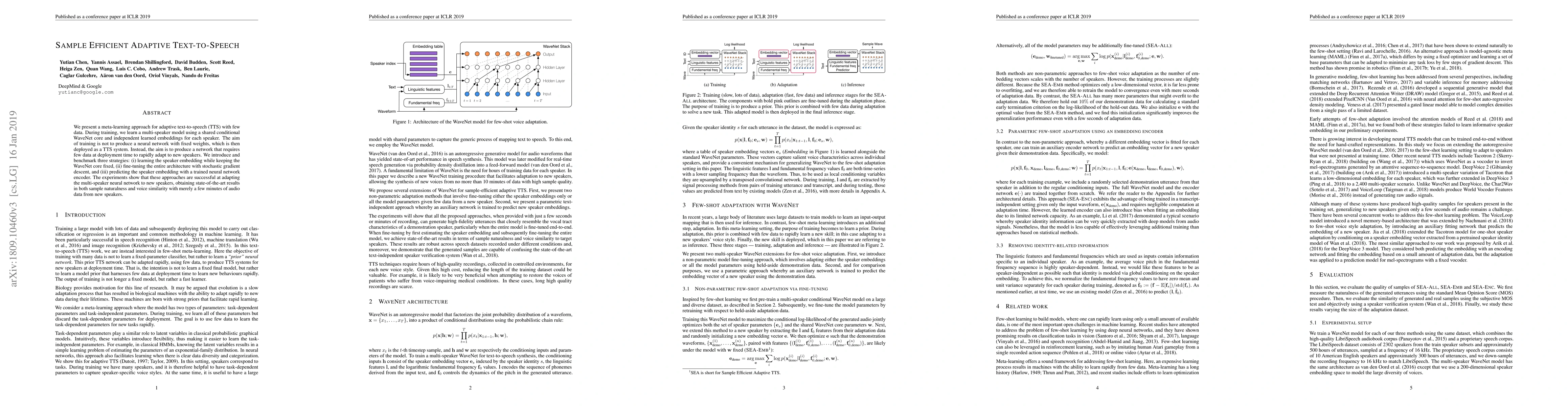 We present a meta-learning approach for adaptive text-to-speech (TTS) with few data. During training, we learn a multi-speaker model using a shared conditional WaveNet core and independent learned embeddings for each speaker. The aim of training is not to produce a neural network with fixed weights, which is then deployed as a TTS system. Instead, the aim is to produce a network that requires few data at deployment time to rapidly adapt to new speakers. We introduce and benchmark three strategies: (i) learning the speaker embedding while keeping the WaveNet core fixed, (ii) fine-tuning the entire architecture with stochastic gradient descent, and (iii) predicting the speaker embedding with a trained neural network encoder. The experiments show that these approaches are successful at adapting the multi-speaker neural network to new speakers, obtaining state-of-the-art results in both sample naturalness and voice similarity with merely a few minutes of audio data from new speakers.