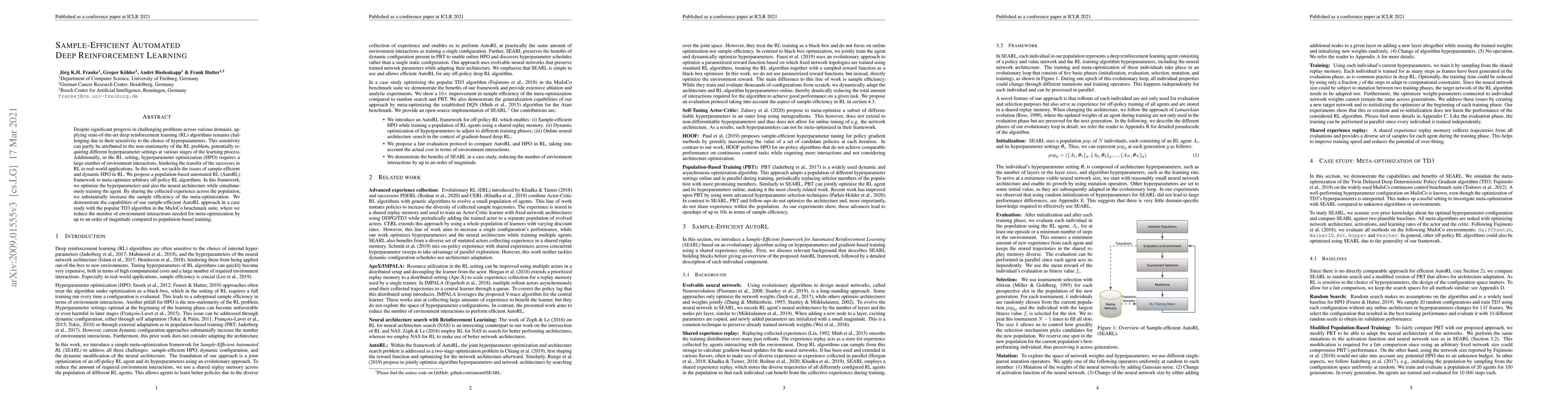 This paper proposes a population-based automated reinforcement learning framework to optimize hyperparameters and neural architecture dynamically, significantly enhancing sample efficiency. The approach shares experience across a population to reduce the number of environment interactions needed for meta-optimization, demonstrating substantial improvements in the TD3 algorithm on MuJoCo benchmarks.