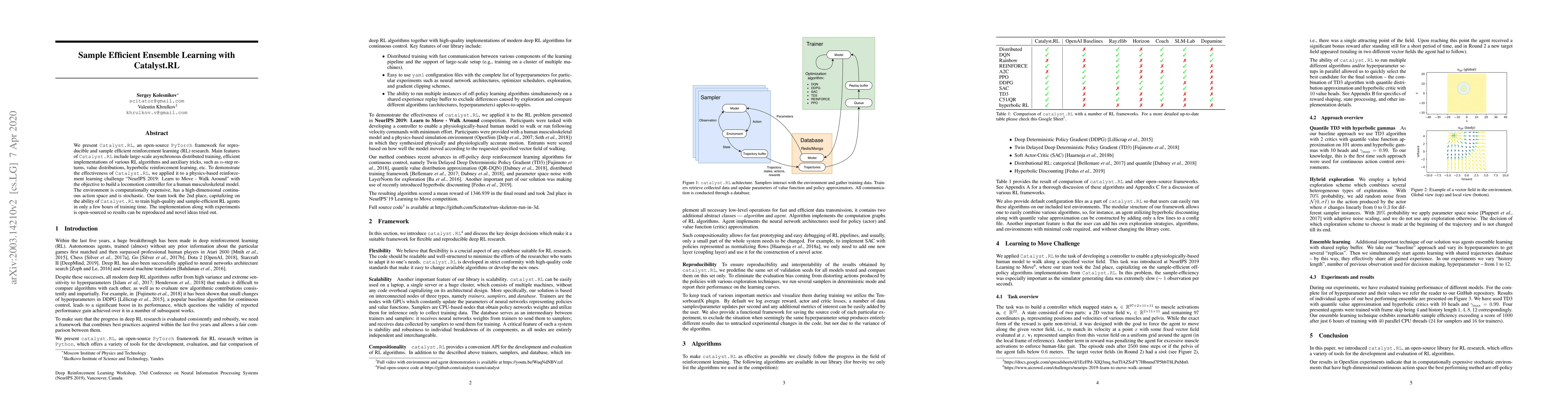 Catalyst.RL is an open-source PyTorch framework designed for efficient reinforcement learning research, featuring distributed training and various RL algorithms. It was successfully applied to a challenging locomotion control task, achieving 2nd place with high sample efficiency.