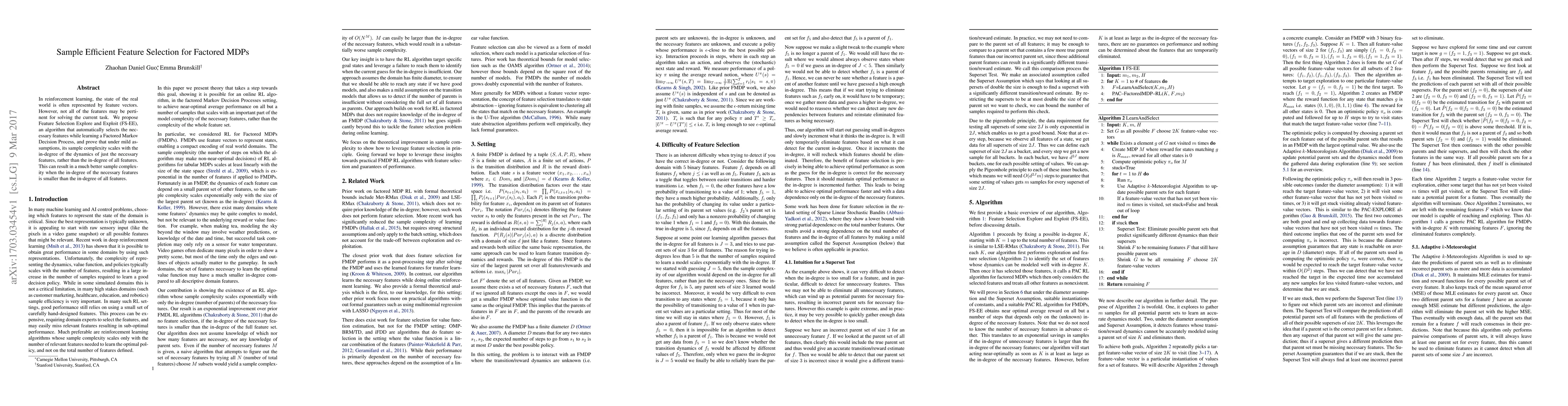 This paper proposes a new algorithm called Feature Selection Explore and Exploit to select necessary features in reinforcement learning for factored MDPs, reducing sample complexity.