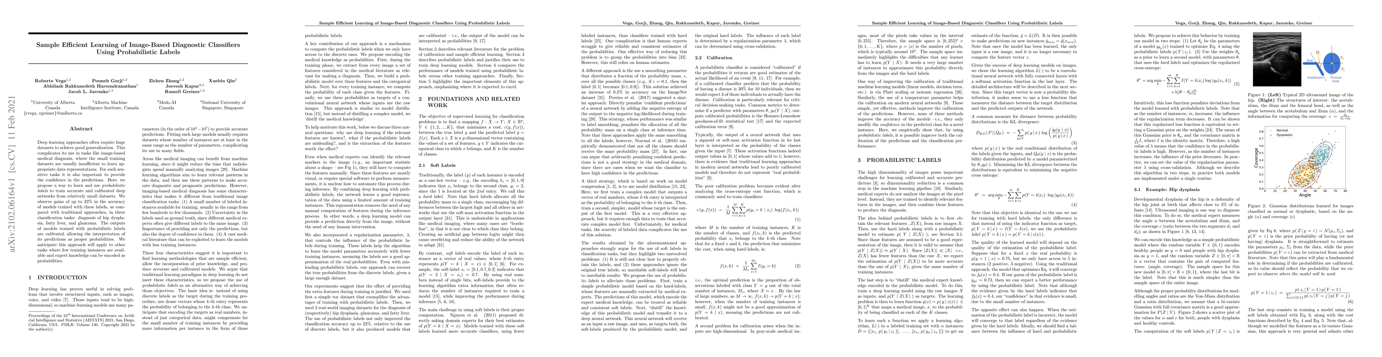 Deep learning approaches often require huge datasets to achieve good generalization. This complicates its use in tasks like image-based medical diagnosis, where the small training datasets are usually insufficient to learn appropriate data representations. For such sensitive tasks it is also important to provide the confidence in the predictions. Here, we propose a way to learn and use probabilistic labels to train accurate and calibrated deep networks from relatively small datasets. We observe gains of up to 22% in the accuracy of models trained with these labels, as compared with traditional approaches, in three classification tasks: diagnosis of hip dysplasia, fatty liver, and glaucoma. The outputs of models trained with probabilistic labels are calibrated, allowing the interpretation of its predictions as proper probabilities. We anticipate this approach will apply to other tasks where few training instances are available and expert knowledge can be encoded as probabilities.