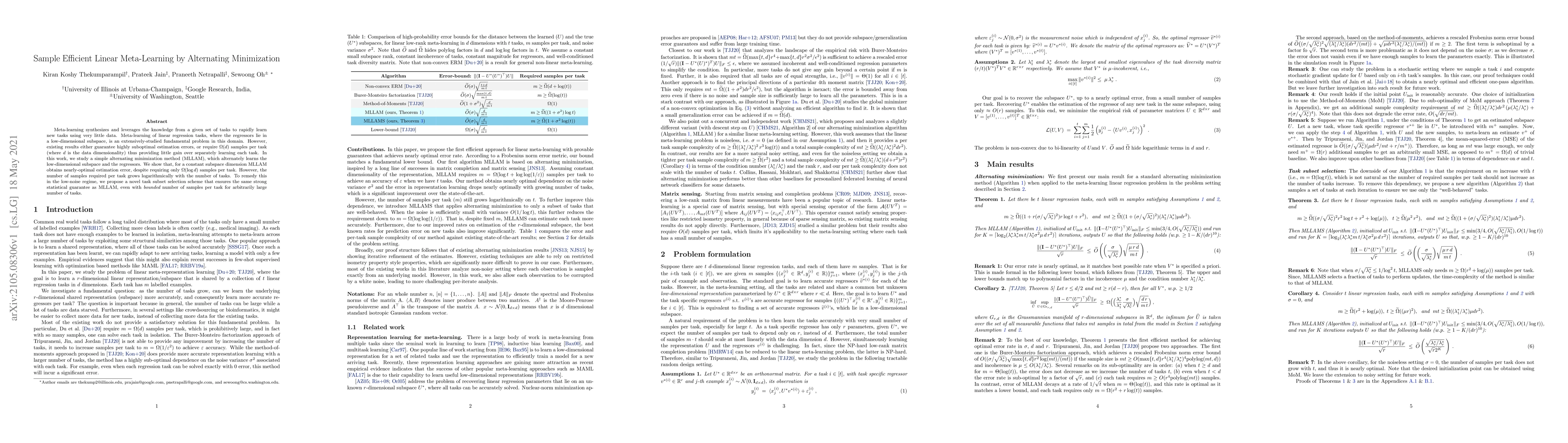 Meta-learning synthesizes and leverages the knowledge from a given set of tasks to rapidly learn new tasks using very little data. Meta-learning of linear regression tasks, where the regressors lie in a low-dimensional subspace, is an extensively-studied fundamental problem in this domain. However, existing results either guarantee highly suboptimal estimation errors, or require $\Omega(d)$ samples per task (where $d$ is the data dimensionality) thus providing little gain over separately learning each task. In this work, we study a simple alternating minimization method (MLLAM), which alternately learns the low-dimensional subspace and the regressors. We show that, for a constant subspace dimension MLLAM obtains nearly-optimal estimation error, despite requiring only $\Omega(\log d)$ samples per task. However, the number of samples required per task grows logarithmically with the number of tasks. To remedy this in the low-noise regime, we propose a novel task subset selection scheme that ensures the same strong statistical guarantee as MLLAM, even with bounded number of samples per task for arbitrarily large number of tasks.