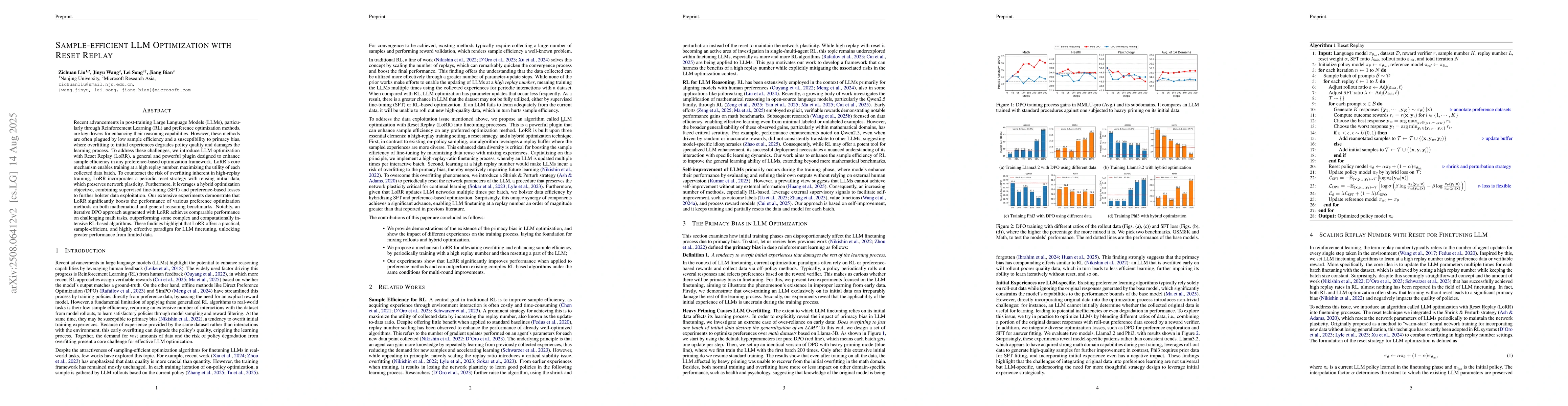 Recent advancements in post-training Large Language Models (LLMs), particularly through Reinforcement Learning (RL) and preference optimization methods, are key drivers for enhancing their reasoning capabilities. However, these methods are often plagued by low sample efficiency and a susceptibility to primacy bias, where overfitting to initial experiences degrades policy quality and damages the learning process. To address these challenges, we introduce LLM optimization with Reset Replay (LoRR), a general and powerful plugin designed to enhance sample efficiency in any preference-based optimization framework. LoRR core mechanism enables training at a high replay number, maximizing the utility of each collected data batch. To counteract the risk of overfitting inherent in high-replay training, LoRR incorporates a periodic reset strategy with reusing initial data, which preserves network plasticity. Furthermore, it leverages a hybrid optimization objective, combining supervised fine-tuning (SFT) and preference-based losses to further bolster data exploitation. Our extensive experiments demonstrate that LoRR significantly boosts the performance of various preference optimization methods on both mathematical and general reasoning benchmarks. Notably, an iterative DPO approach augmented with LoRR achieves comparable performance on challenging math tasks, outperforming some complex and computationally intensive RL-based algorithms. These findings highlight that LoRR offers a practical, sample-efficient, and highly effective paradigm for LLM finetuning, unlocking greater performance from limited data.