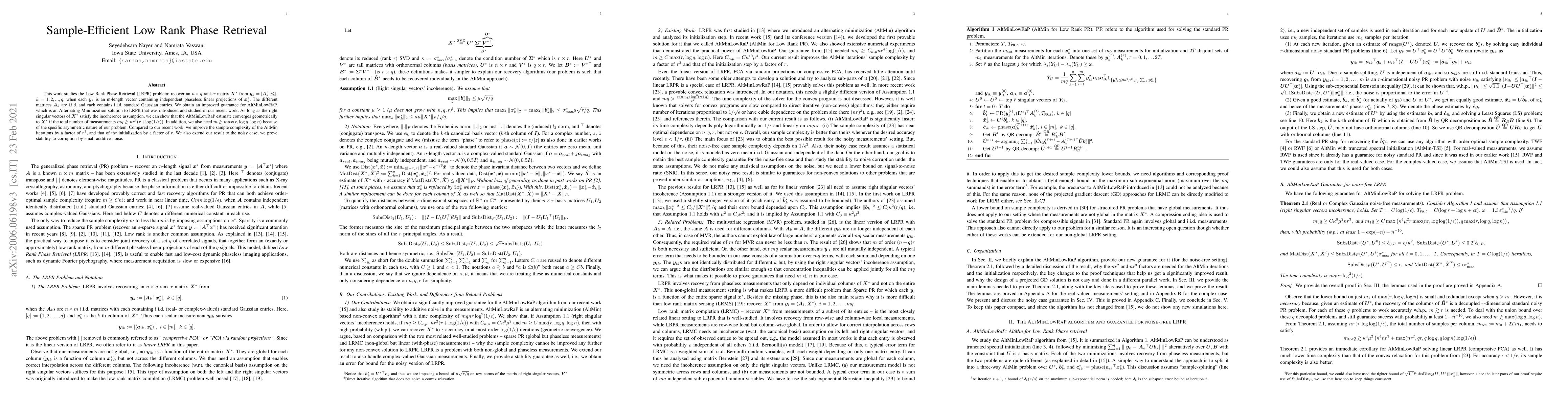 This paper addresses the Low Rank Phase Retrieval problem, improving the sample complexity of an Alternating Minimization solution by a factor of $r^2$ for iterations and $r$ for initialization. It demonstrates geometric convergence under certain incoherence assumptions and extends the result to handle small additive noise.