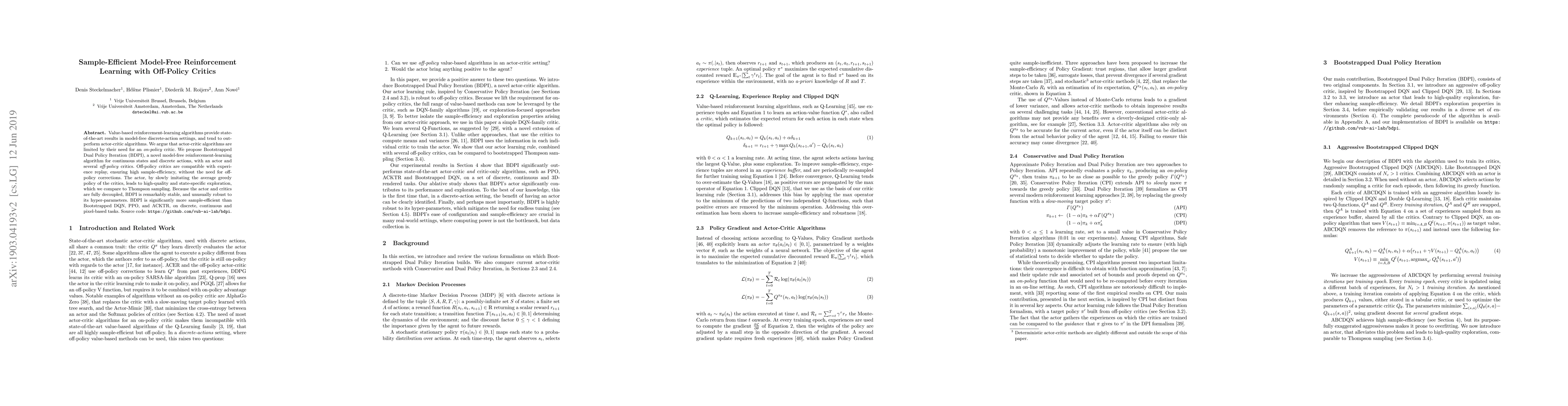 This paper introduces Bootstrapped Dual Policy Iteration (BDPI), a novel model-free reinforcement learning algorithm that leverages off-policy critics for continuous state-discrete action environments, achieving high sample-efficiency and stability without the need for on-policy learning. BDPI outperforms other methods like Bootstrapped DQN, PPO, and ACKTR across various tasks.