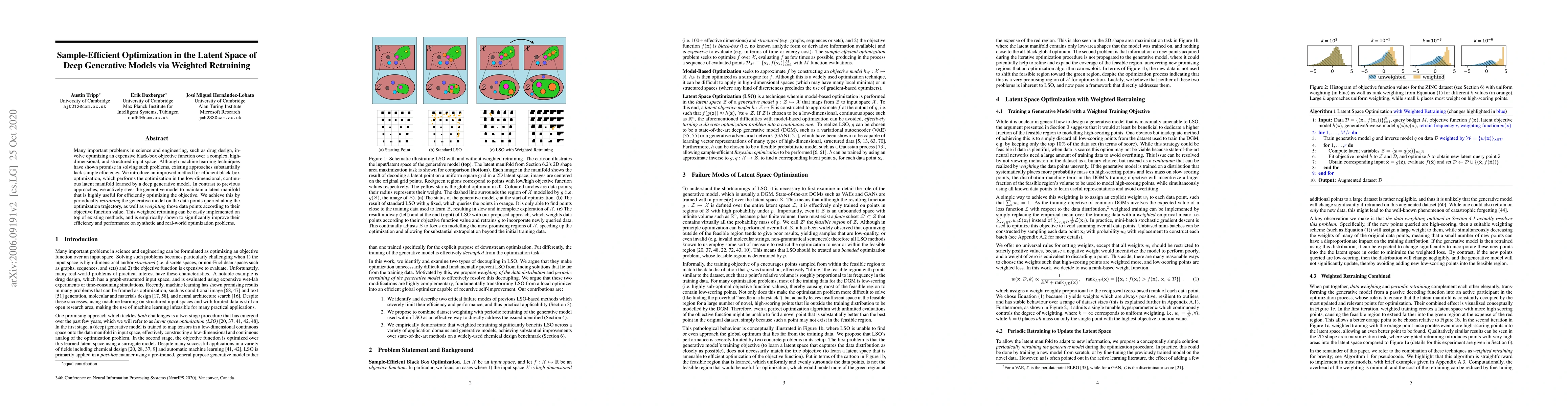 This paper proposes a method for sample-efficient optimization in the latent space of deep generative models by periodically retraining the model on weighted data points along the optimization trajectory. This approach improves efficiency and performance for complex, high-dimensional black-box optimization problems.