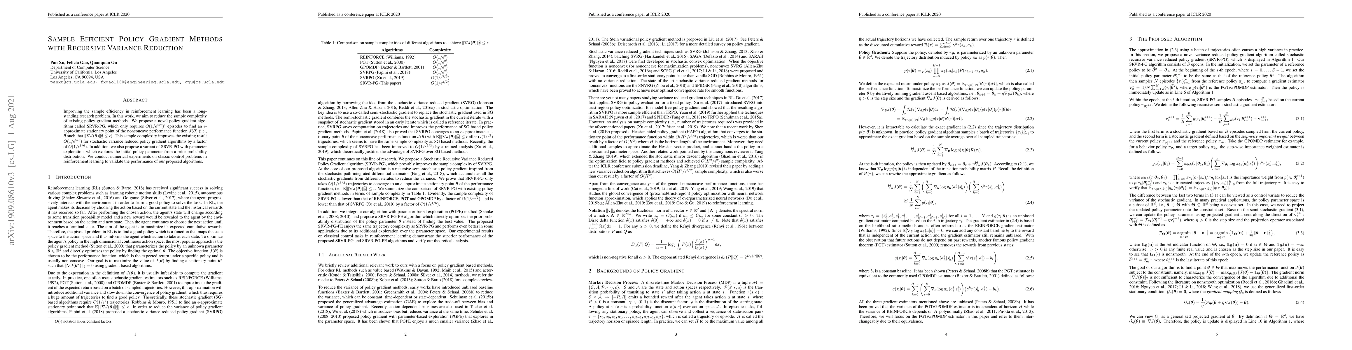 A new policy gradient algorithm called SRVR-PG improves sample efficiency in reinforcement learning, requiring only $O(1/ ext{epsilon}^{3/2})$ episodes to find an $ ext{epsilon}$-approximate stationary point, reducing the complexity by a factor of $O(1/ ext{epsilon}^{1/6})$.