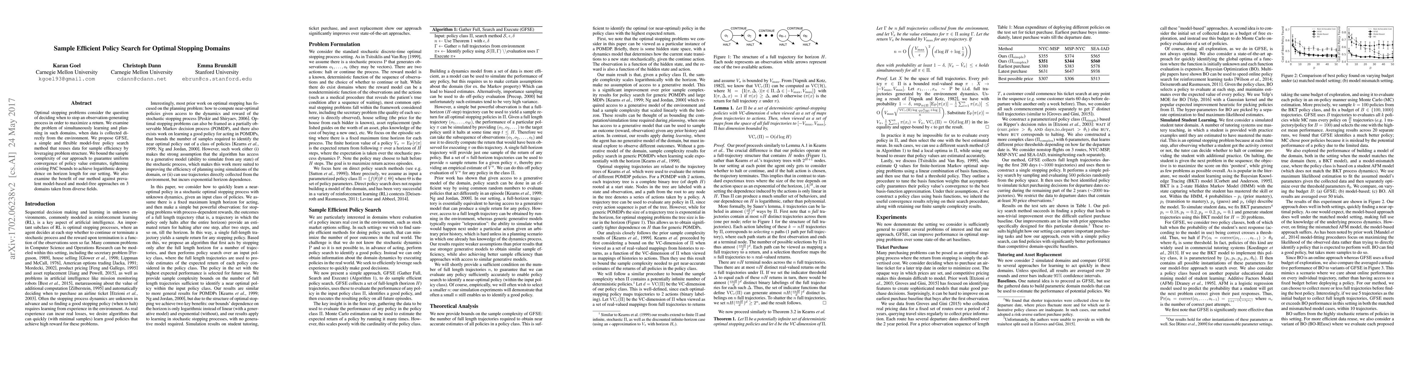 This paper proposes a new policy search method called GFSE for optimal stopping domains, achieving logarithmic sample complexity with guaranteed uniform convergence. It compares favorably to model-based and model-free approaches on three diverse fields.