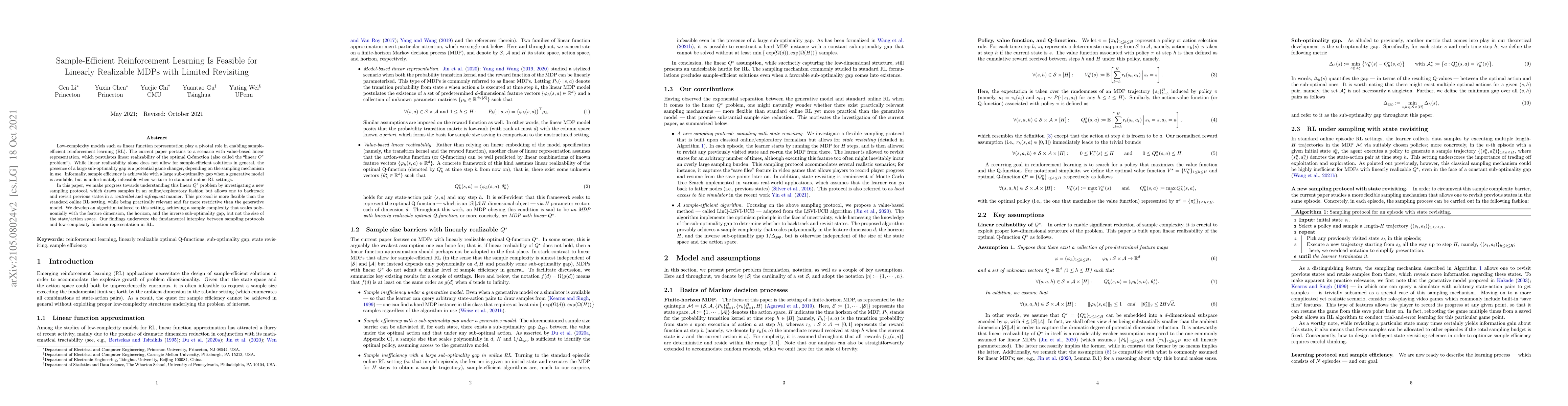 This paper explores sample-efficient reinforcement learning for linearly realizable Markov Decision Processes (MDPs) with limited state revisiting. It introduces a novel sampling protocol that allows controlled backtracking, achieving polynomial sample complexity relative to feature dimension, horizon, and sub-optimality gap, but not state/action space size.