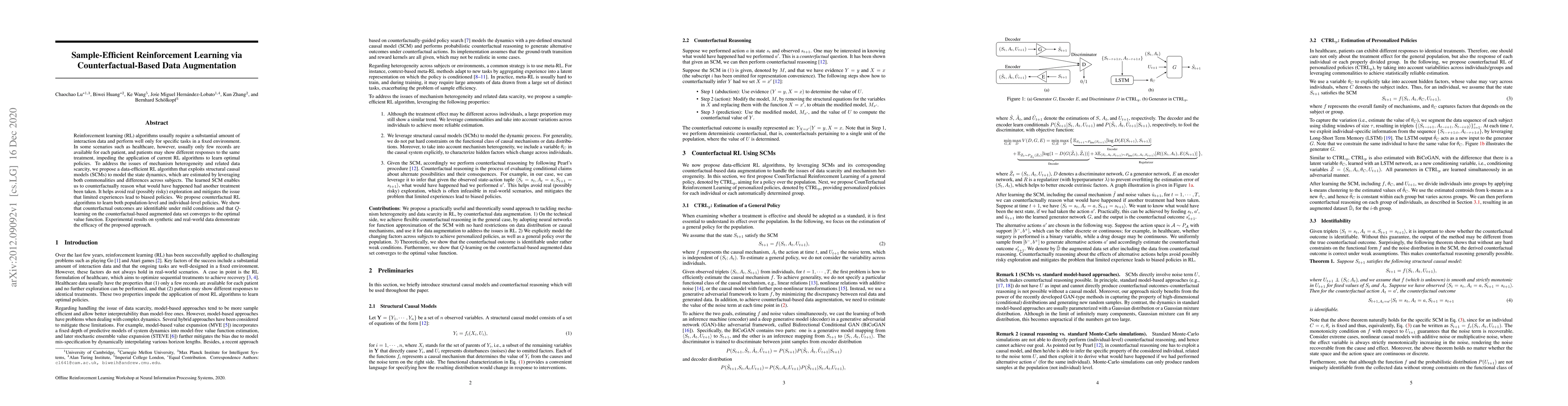 This paper proposes a sample-efficient reinforcement learning algorithm that leverages counterfactual reasoning and structural causal models to address data scarcity and mechanism heterogeneity, enabling effective policy learning with limited real-world interactions. The approach augments data using counterfactual outcomes, demonstrating convergence to optimal value functions and improved performance in both synthetic and real-world experiments.