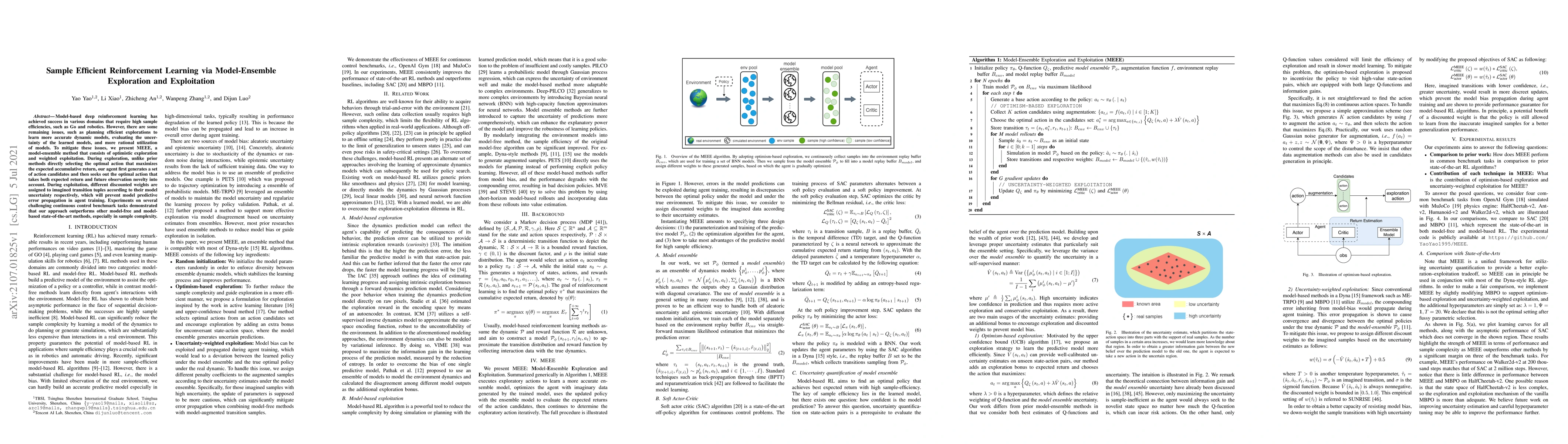 This paper introduces MEEE, a model-ensemble reinforcement learning method that enhances exploration and exploitation through optimistic action selection and weighted exploitation based on model uncertainty, achieving superior sample efficiency in continuous control tasks compared to existing methods.
