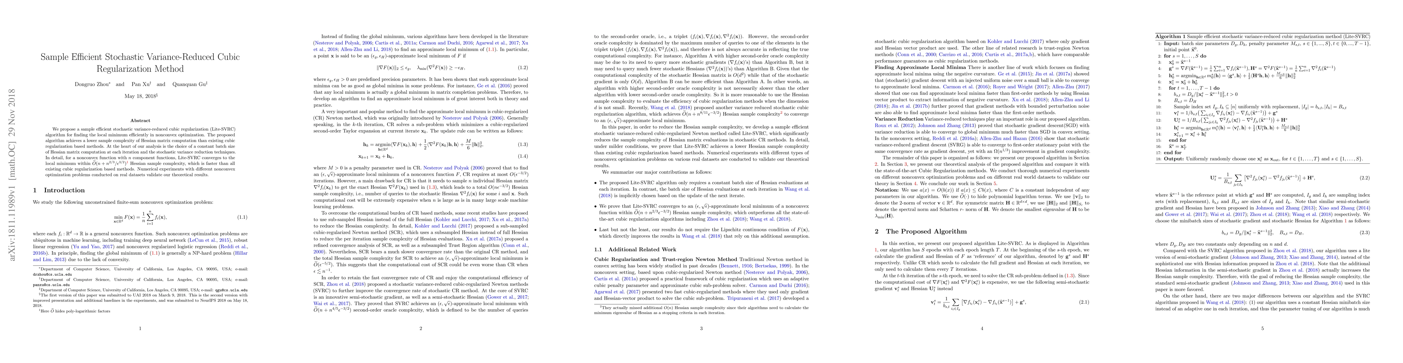 This paper introduces the Lite-SVRC algorithm, a sample efficient stochastic variance-reduced cubic regularization method for nonconvex optimization, achieving lower sample complexity for Hessian matrix computation compared to existing methods. Theoretical analysis and numerical experiments demonstrate its faster convergence to local minima.