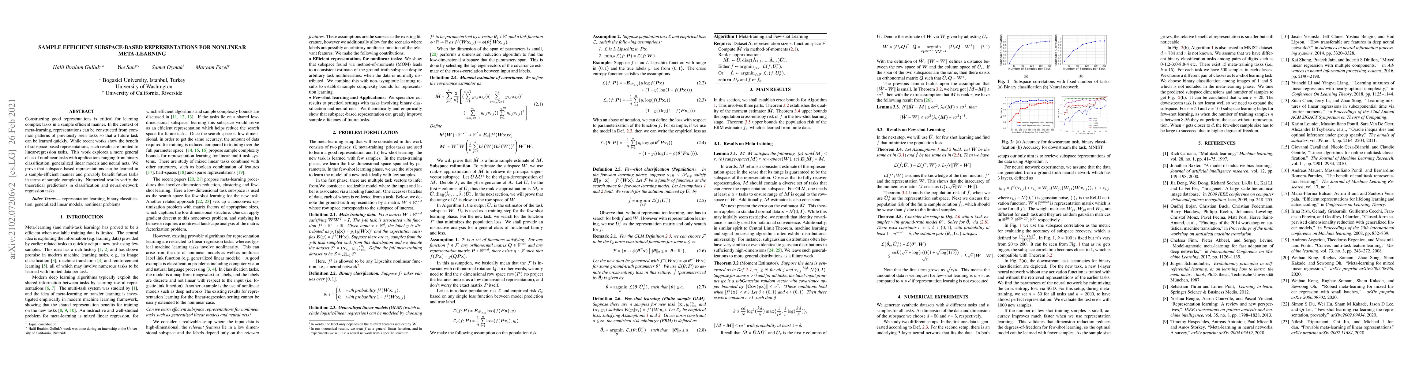 This paper investigates subspace-based representations for nonlinear meta-learning, proving their sample efficiency and effectiveness for tasks like binary classification and neural-network regression. Theoretical results are validated through numerical experiments.