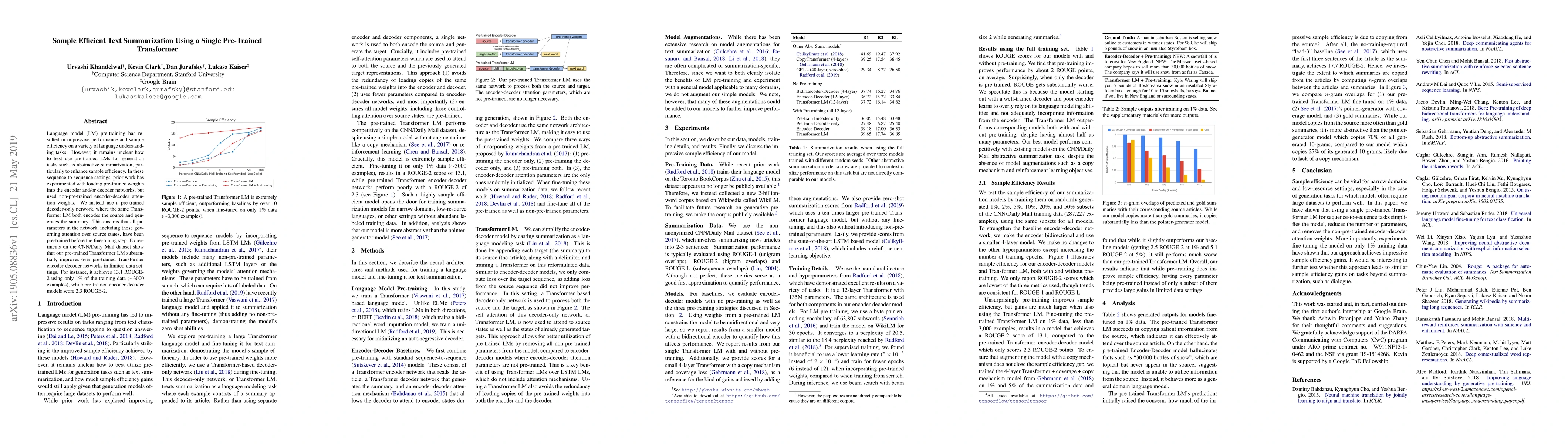 This paper proposes using a single pre-trained Transformer model for both encoding the source text and generating the summary, enhancing sample efficiency in text summarization. Experiments demonstrate significant improvements over traditional encoder-decoder models, achieving 13.1 ROUGE-2 with only 1% of the training data.