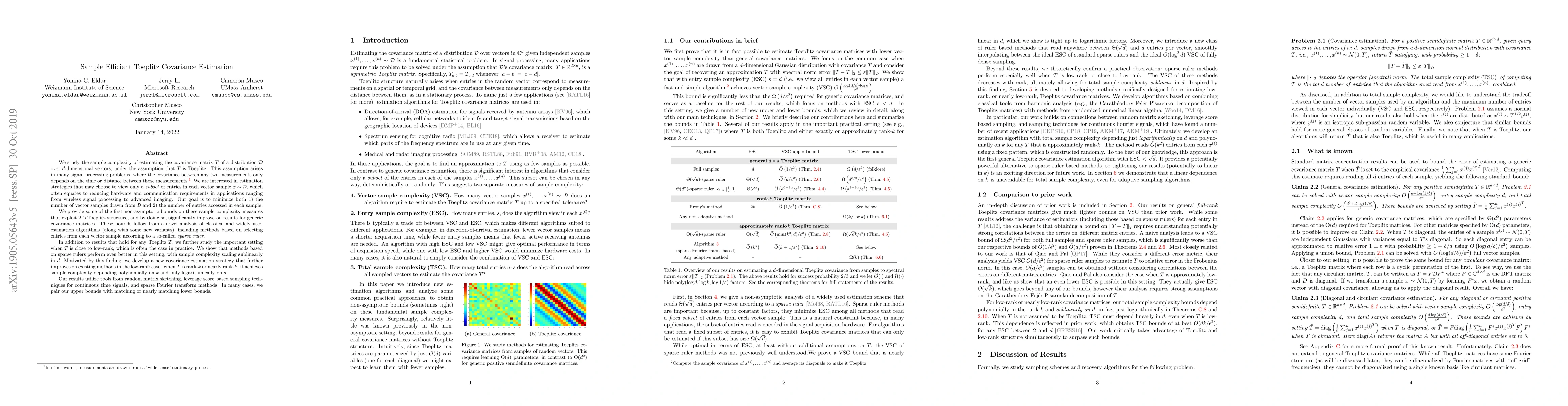 We study the sample complexity of estimating the covariance matrix $T$ of a distribution $\mathcal{D}$ over $d$-dimensional vectors, under the assumption that $T$ is Toeplitz. This assumption arises in many signal processing problems, where the covariance between any two measurements only depends on the time or distance between those measurements. We are interested in estimation strategies that may choose to view only a subset of entries in each vector sample $x \sim \mathcal{D}$, which often equates to reducing hardware and communication requirements in applications ranging from wireless signal processing to advanced imaging. Our goal is to minimize both 1) the number of vector samples drawn from $\mathcal{D}$ and 2) the number of entries accessed in each sample. We provide some of the first non-asymptotic bounds on these sample complexity measures that exploit $T$'s Toeplitz structure, and by doing so, significantly improve on results for generic covariance matrices. Our bounds follow from a novel analysis of classical and widely used estimation algorithms (along with some new variants), including methods based on selecting entries from each vector sample according to a so-called sparse ruler. In many cases, we pair our upper bounds with matching or nearly matching lower bounds. In addition to results that hold for any Toeplitz $T$, we further study the important setting when $T$ is close to low-rank, which is often the case in practice. We show that methods based on sparse rulers perform even better in this setting, with sample complexity scaling sublinearly in $d$. Motivated by this finding, we develop a new covariance estimation strategy that further improves on all existing methods in the low-rank case: when $T$ is rank-$k$ or nearly rank-$k$, it achieves sample complexity depending polynomially on $k$ and only logarithmically on $d$.