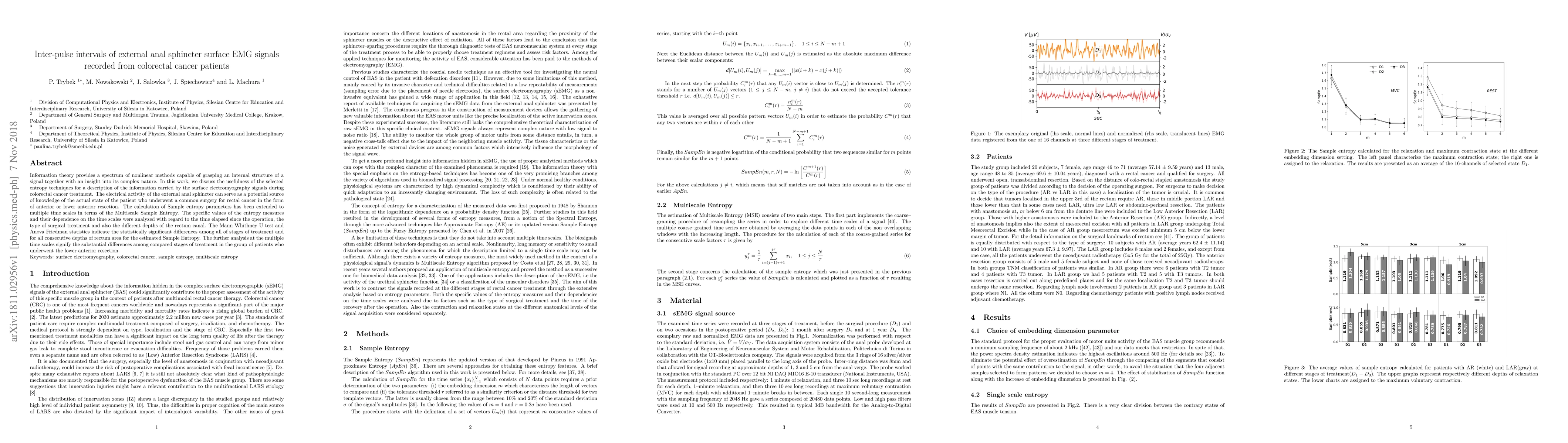 Information theory provides a spectrum of nonlinear methods capable of grasping an internal structure of a signal together with an insight into its complex nature. In this work, we discuss the usefulness of the selected entropy techniques for a description of the information carried by the surface electromyography signals during colorectal cancer treatment. The electrical activity of the external anal sphincter can serve as a potential source of knowledge of the actual state of the patient who underwent a common surgery for rectal cancer in the form of anterior or lower anterior resection. The calculation of Sample entropy parameters has been extended to multiple time scales in terms of the Multiscale Sample Entropy. The specific values of the entropy measures and their dependence on the time scales were analyzed with regard to the time elapsed since the operation, the type of surgical treatment and also the different depths of the rectum canal. The Mann Whithney U test and Anova Friedman statistics indicate the statistically significant differences among all of stages of treatment and for all consecutive depths of rectum area for the estimated Sample Entropy. The further analysis at the multiple time scales signify the substantial differences among compared stages of treatment in the group of patients who underwent the lower anterior resection.