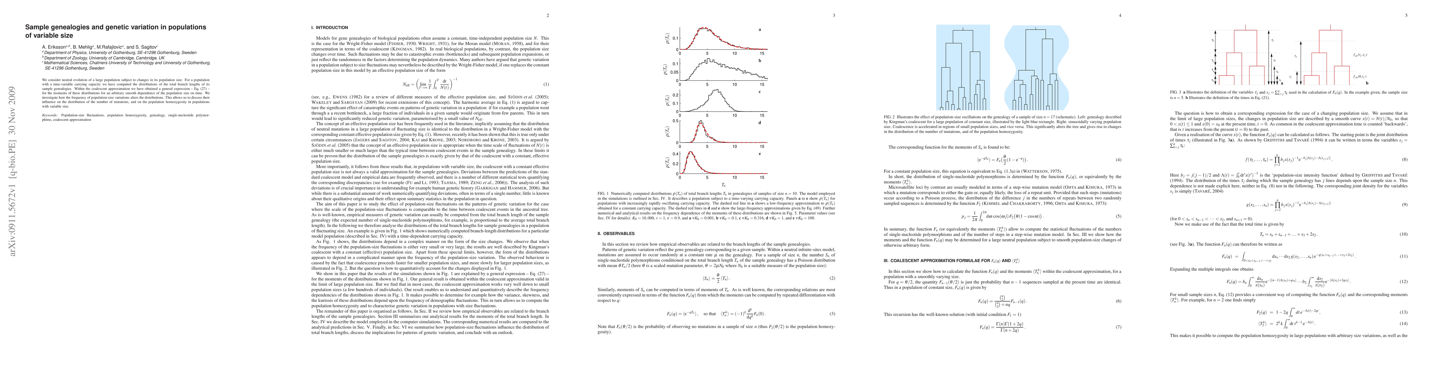 This paper examines the neutral evolution in populations with fluctuating sizes, deriving expressions for the moments of sample genealogy distributions under varying population sizes. It explores how changes in population size affect genetic variation, mutation frequency, and homozygosity.
