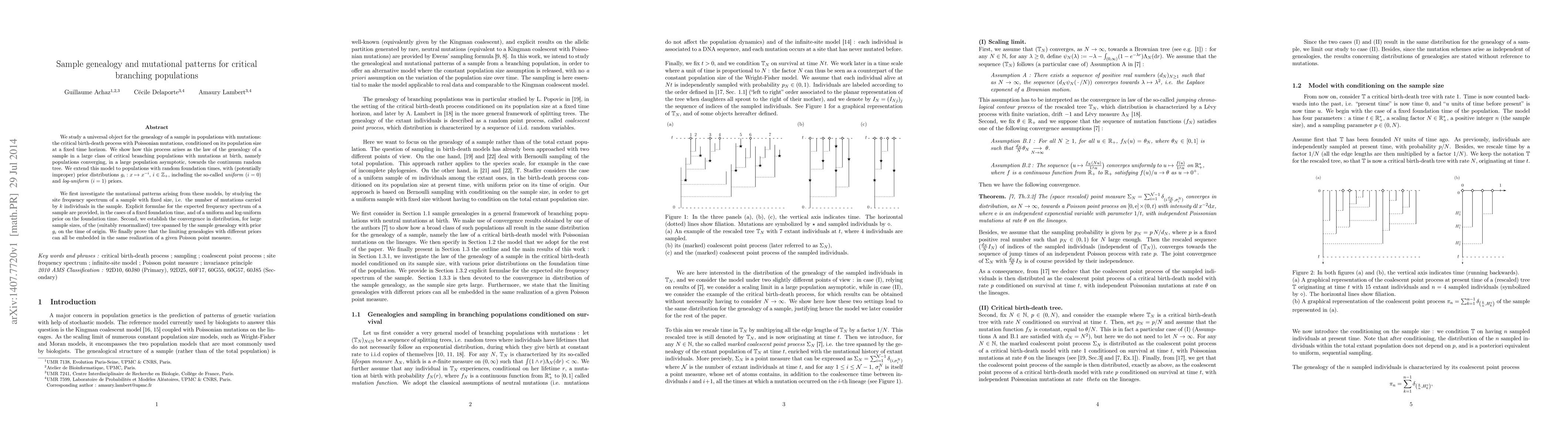 This paper explores the genealogy of critical branching populations with mutations, using a conditioned birth-death process with Poissonian mutations. It provides explicit formulae for mutational patterns and proves the convergence of the sample genealogy to a continuum random tree under various prior distributions.